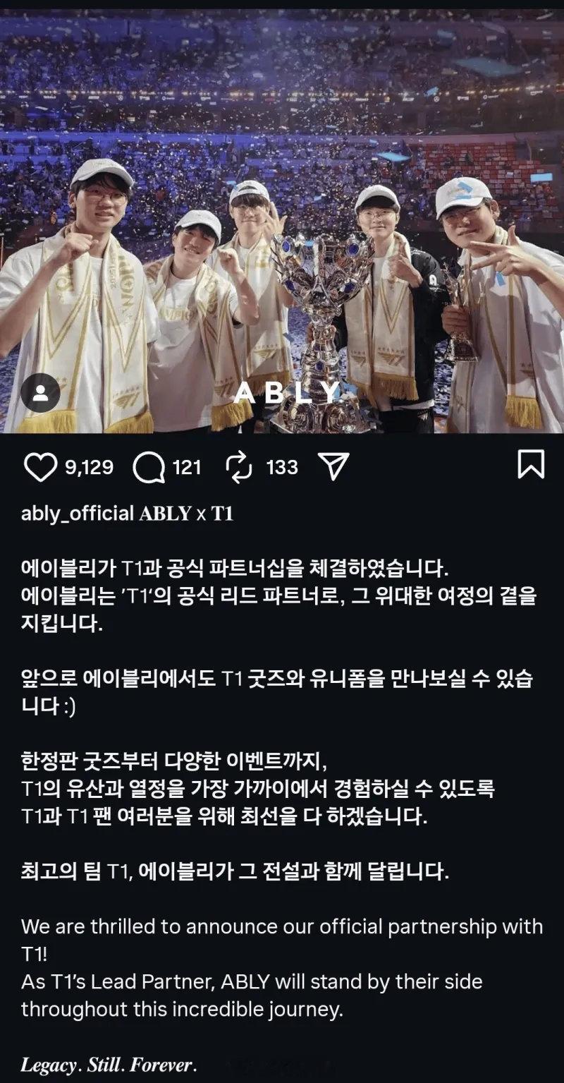 谁懂啊,T1又签了一个新的顶级赞助ABLY看新闻是一个韩国电商平台,去年阿里巴巴画了一千亿韩援入股5%,也就是公司估值大概100亿人民币,赞助级别是LEAD PARTNER,跟SK电信平级,仅次于沙特RSG,高于其他所有赞助商