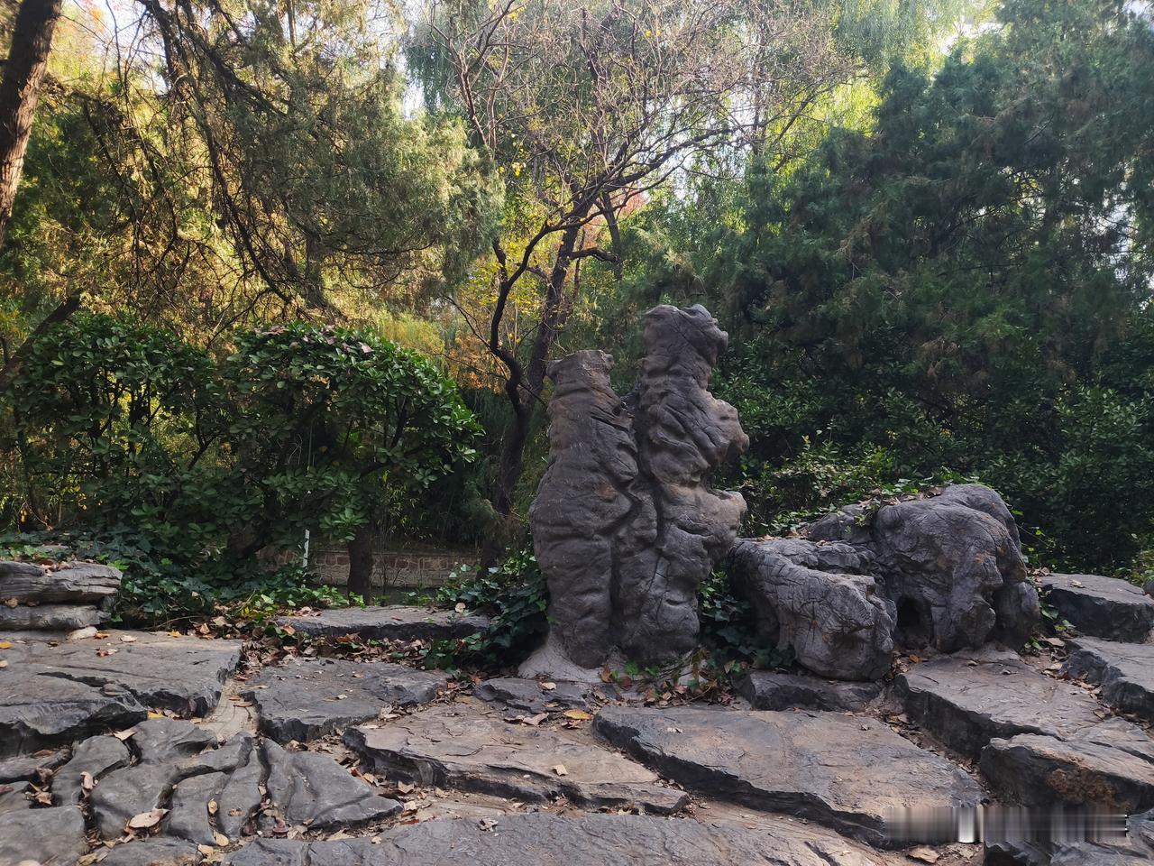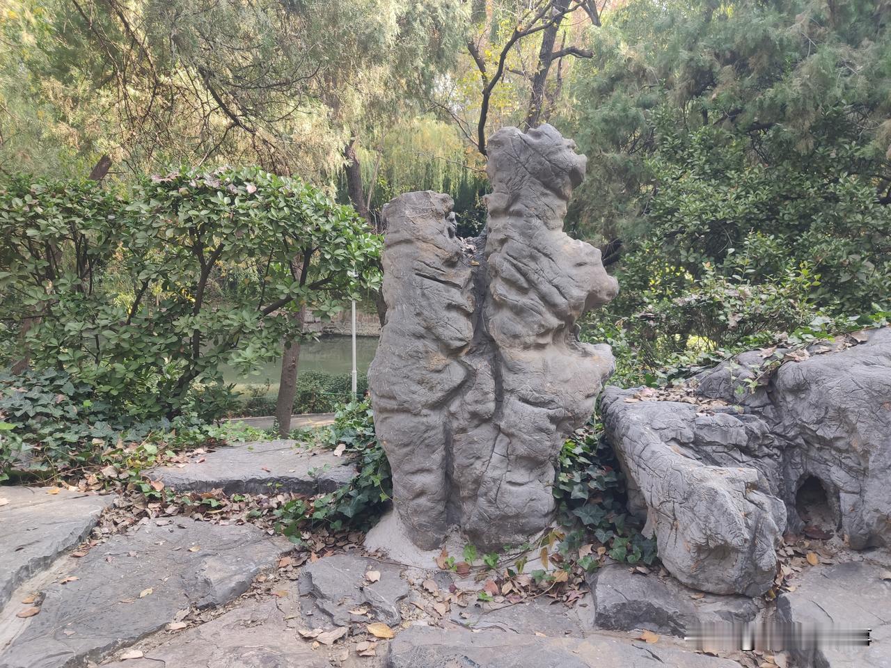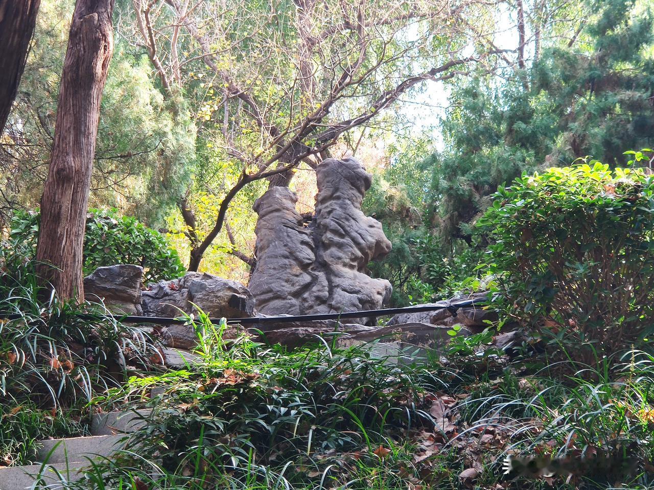 今天在郑州市人民公园手语岛上看到山上凉亭的南边有几个石头,其中两个紧挨一起的突然发现看着像是两只相拥而立,向同一方向张望的动物。诸位看看,是否有同感?因为住的离人民公园比较近,所以可谓是三天两头到公园里转转走走,可直到今天才发现这个石头景致的这一现象。
