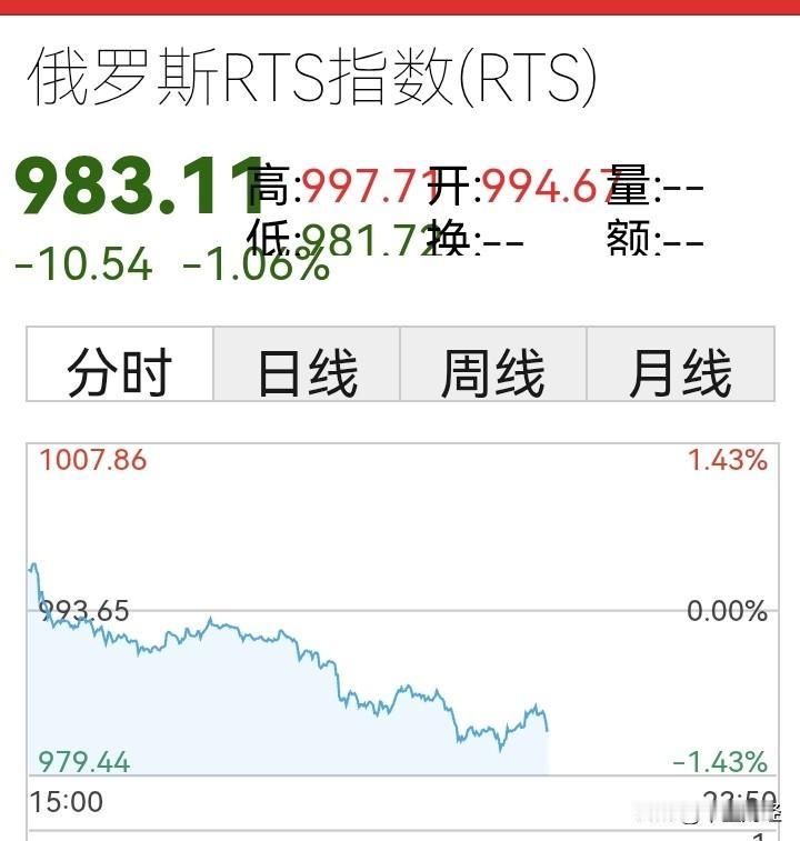 【俄罗斯股市】刚才,看了一下全球股市,目前欧洲股市一片通红,但俄罗斯股市成为另类,股指不停的下跌,疲弱不堪! 看看rts指数,自从破位千点之后,就很难再收上去,这显示,如果出现突发性,实质性利空,俄罗斯股市有可能出现一个大跌或者暴跌!