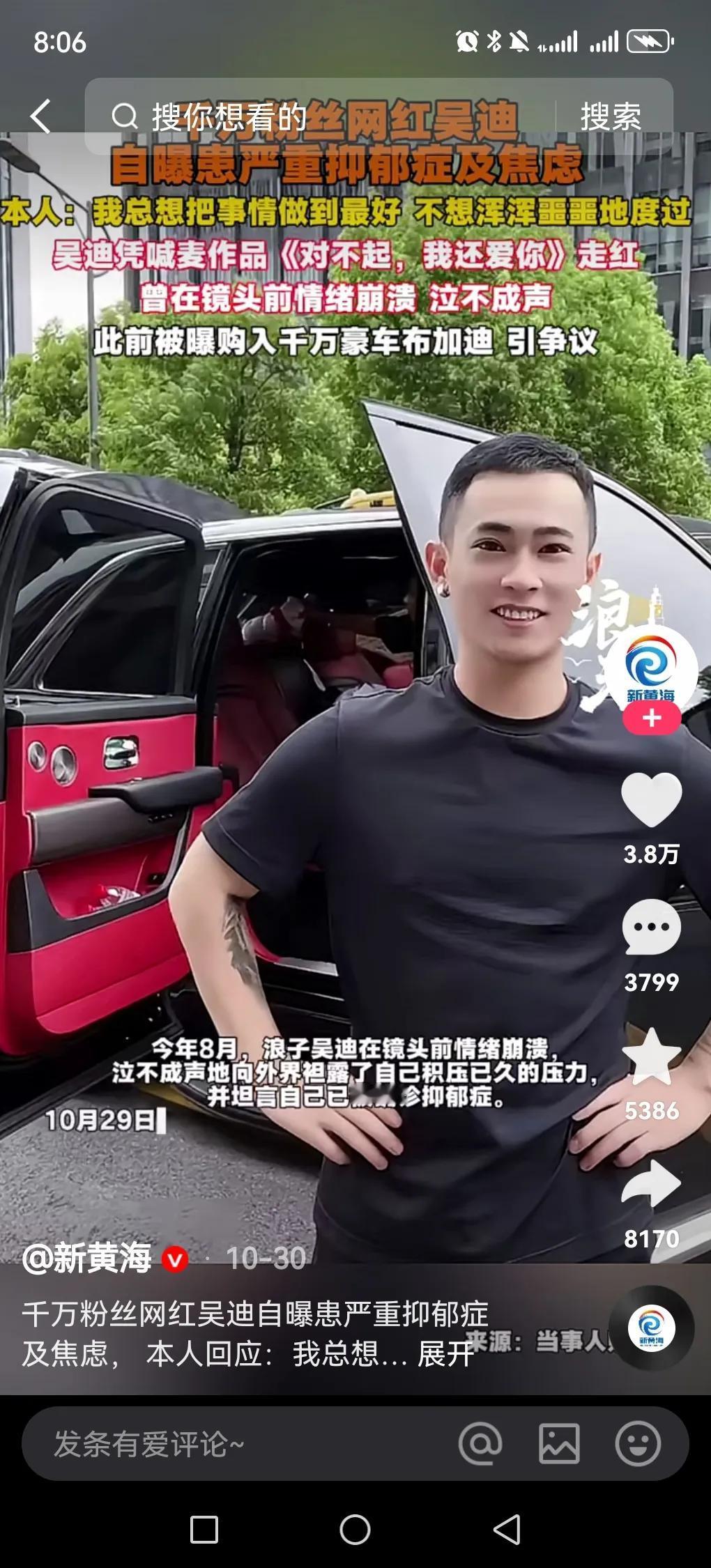浪子吴迪,原名孙强,粉丝千万,资产上亿,山东聊城人,吴迪如果没有网络,他就是一个农村的小混混,甚至连媳妇也娶不起,因为他的个头太低了,被网友叫作“武大郎”,吴迪也就是玩的早碰到了网红时期的福利,吴迪有两个把兄弟,四兄弟有“老大半阳,老二王小义,老三吴迪,老四李耀阳”。另外有七兄弟有:“仙洋,方丈,上官带刀,石头花,吴迪,浩南,小样”,不管在四兄弟和七兄弟当中,吴迪都是属于最有钱的! 别看他近两年不咋正经直播,整天钓鱼,那是兜里有钱不在乎。他敢买8000多万的布加迪,名下车房等资产最少值2亿,现金加资产拢共5 - 6亿。他好时候赚了不少,还不玩扑克、不泡吧、不偷税漏税,稳稳攒下财富。把钱放银行吃利息,每年近千万,养再多孩子都没压力。
