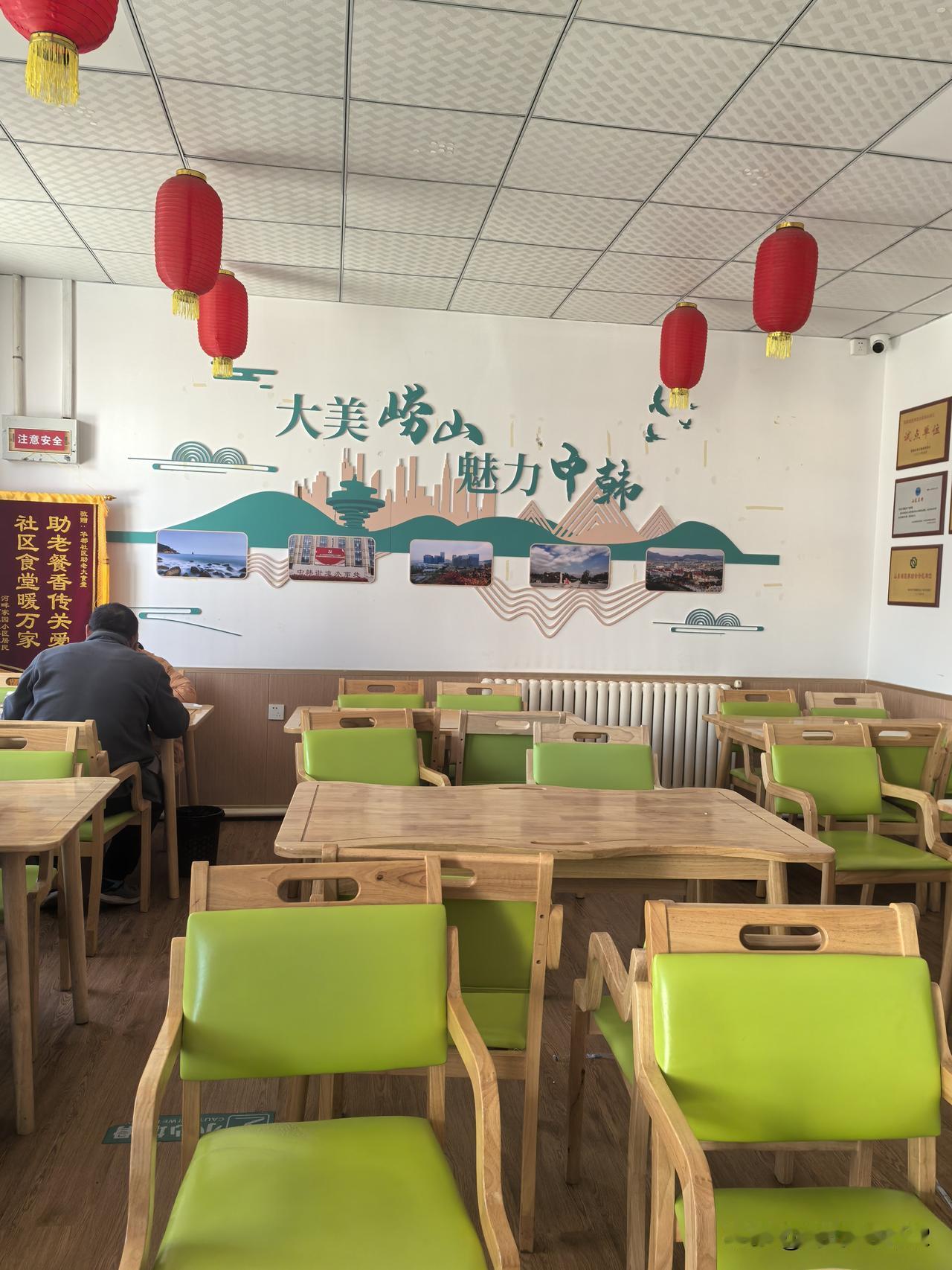 “大美崂山,魅力中韩”,我一进老年食堂大门,就看到老年食堂里布置得焕然一新,对面