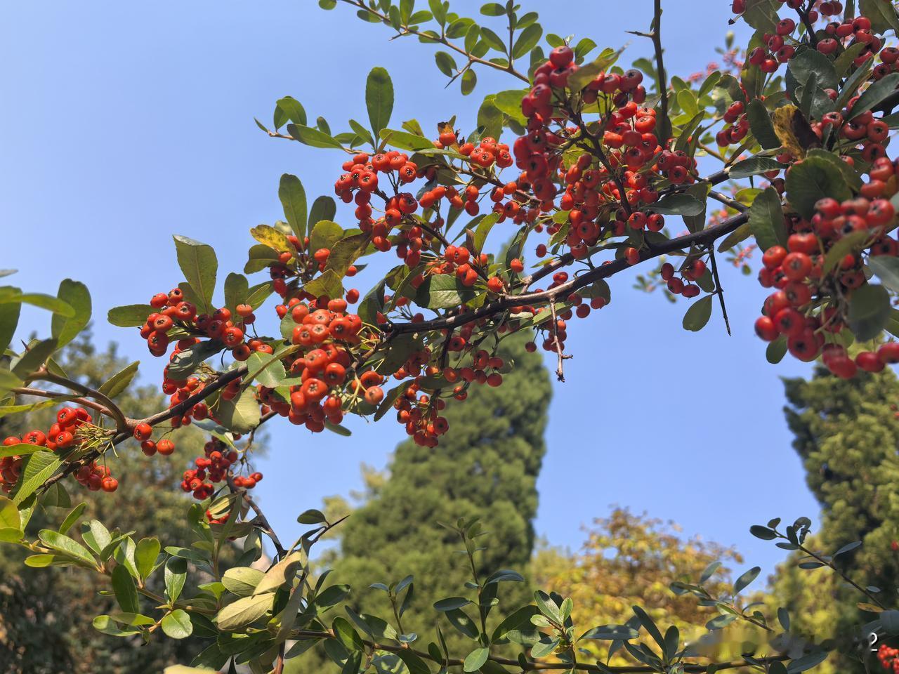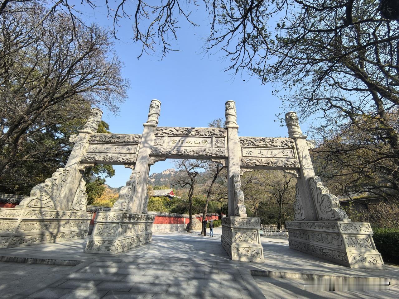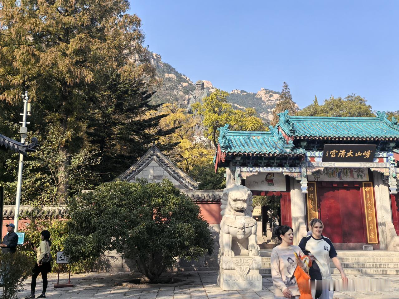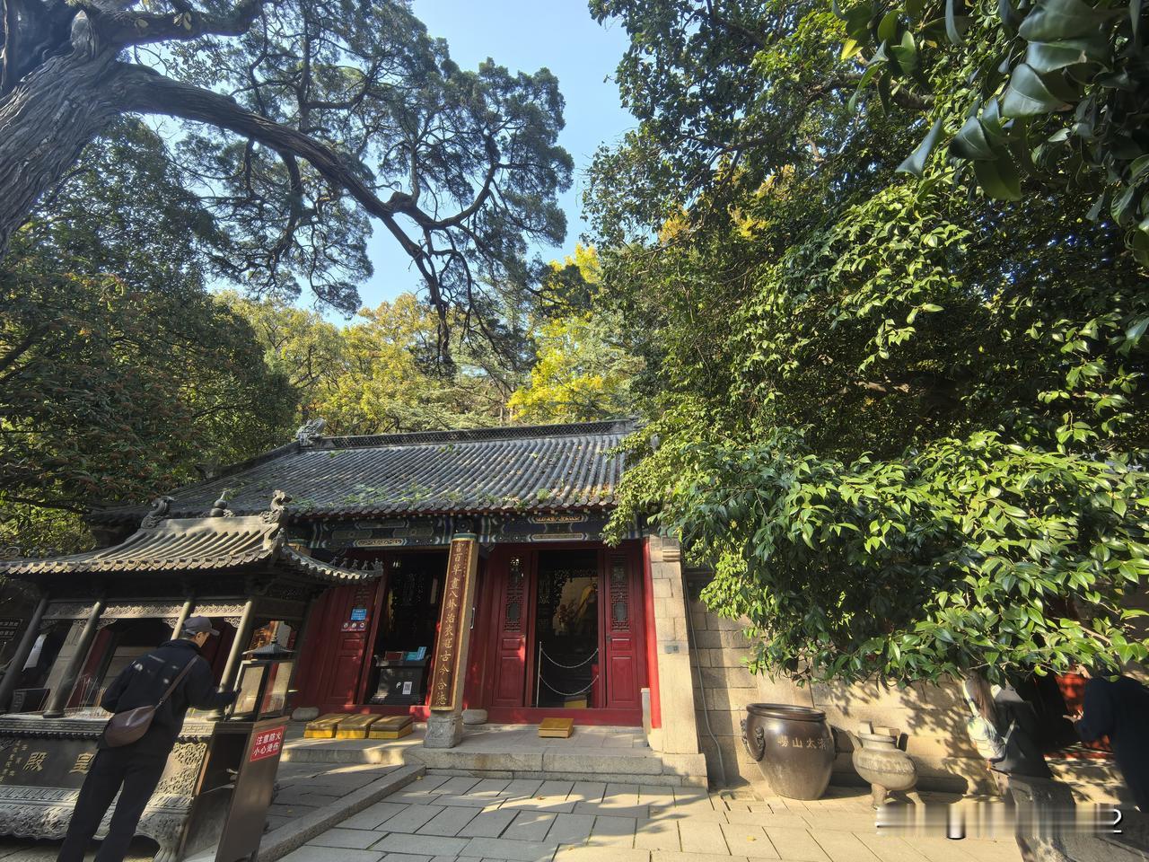 这是昨天我乘坐4号地铁,到崂山大河东站下车,出站后到对面的崂山旅游中心,买票乘旅游大巴车,进入著名的道观太清宫拍到的美景。 太清宫内古树品种繁多,有茶树,松树,柏树,榆树,枫树,白果树等等… 最引人注目的是位于三皇殿中的一棵古柏树,又叫汉柏凌霄。 它己经有2150岁的高龄了,是太清宫中资格最老,年龄最老的树(图7~图9)。 可惜,昨天还不到最佳观赏秋叶的时间,所以树叶的颜色,看上去层次还不太分明。 最佳观赏秋叶的时间,在11月16号之后,至11月底这个时间段最好。 建议有兴趣的朋友可以在这个时间段去观赏太清宫的秋色。