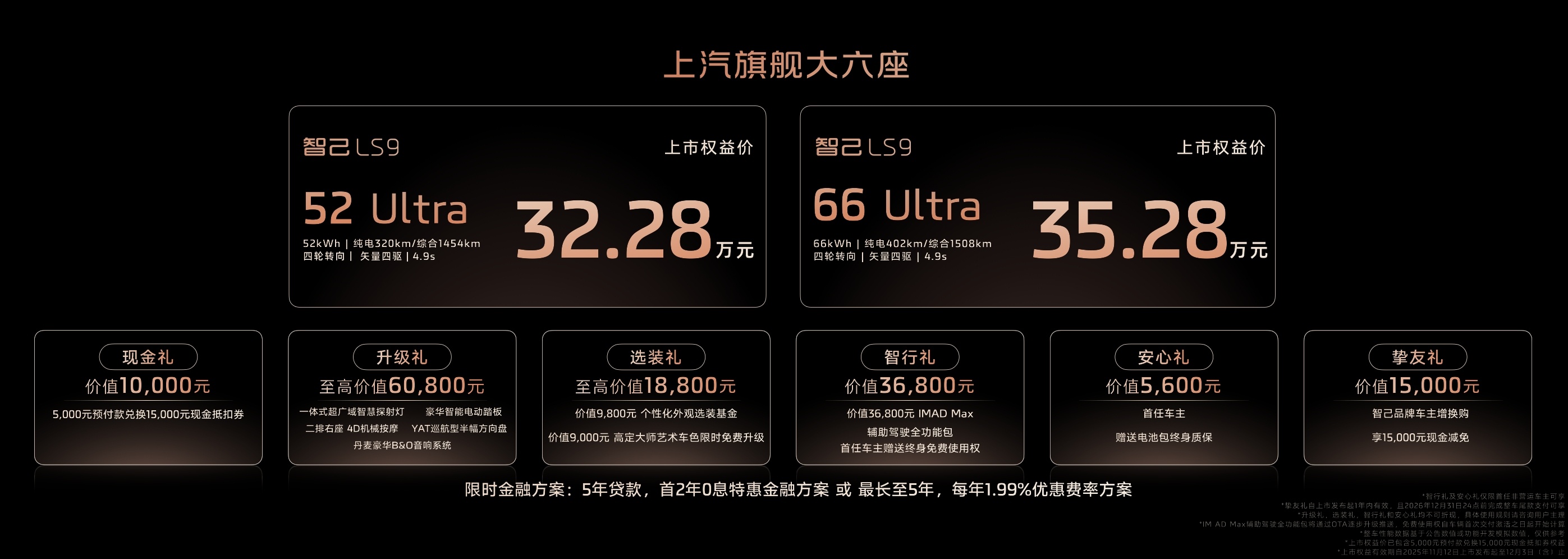 智己LS9的上市权益价52kWh:32.28万起66kWh:35.28万起B&O音响,4D按摩也都免费送了,感觉买个标配就挺香的