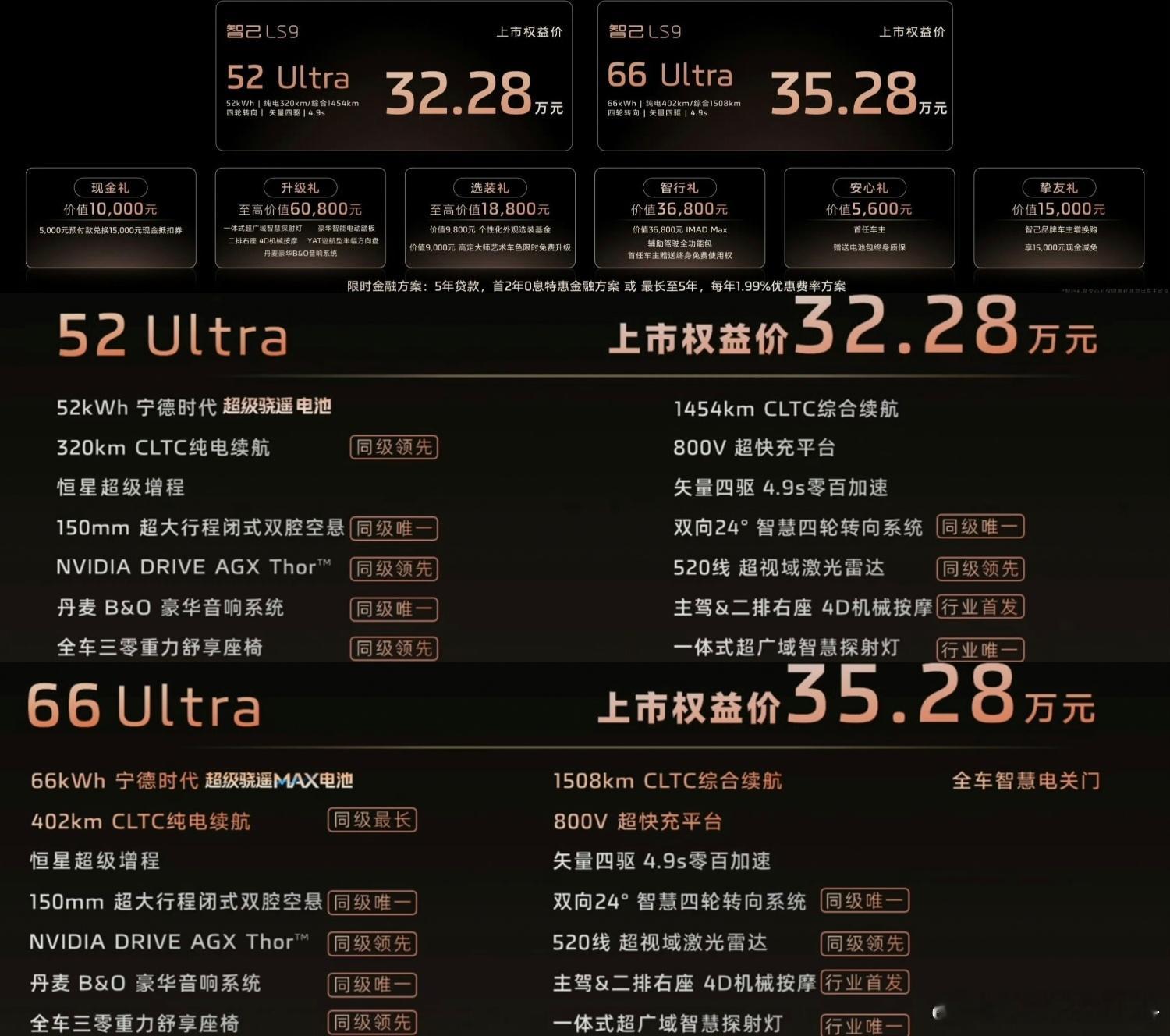 ,两款车型32.28-35.28万元,先说定论——这就是地表最强性价比的9系,之一另一个是银河M9,20万级小城家庭的圆梦之车而智己LS9,则是35万级高线家庭的圆梦之车有了它,你就同时拥有了石墨烯地暖、热水器淋浴、机械滚轮按摩、新风净烟过滤、B&O环绕音响、三把零重力座椅……就差给双拖鞋,给个睡袍,我就敢脱个溜光开车,毕竟这比家里还要豪华呢如果你还是缺乏概念,那我告诉你,低配价格比 次低配增程,还要便宜一万七!而LS9的产品力,是完全奔着超越问界M9去的至少什么520线激光雷达、66度大电池、±12°后轮转向、VGT可变涡轮等等,跟上面一样,问界没有,它有这跟拉踩没关系,主要是上汽也确实没法了,不整点狠活谁给你刷礼物?极氪/领克已经证明了,只要能赚米儿,咬打火机又何妨?25分钟大定5000证明了这一点,接下来,Hyper要快点来了,我先说个数——39.28!