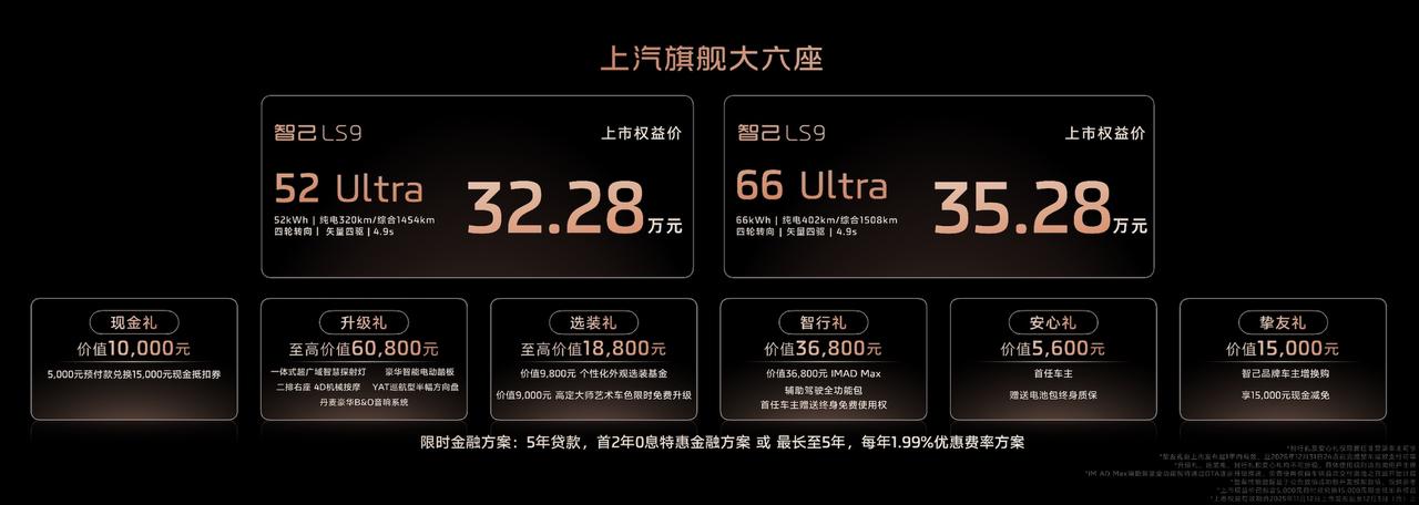 32.28万起!智己LS9:30万级大六座SUV新标杆 11月12日,上汽旗舰智己LS9上市,32.28万元起的权益价,携全系Ultra配置颠覆市场认知。 这车堪称“全能旗舰”:灵蜥数字底盘3.0+双向24°四轮转向,让大SUV转弯比Polo灵活;恒星超级增程加持,402km纯电、1508km综合续航,油电折算能耗仅2.81L/百公里。 智能上,520线激光雷达+英伟达Thor芯片,搭配IM AD Max辅助驾驶;豪华感满满,三把零重力座椅、4D机械按摩、B&O音响一应俱全。 目前新车已到店并开启大定,30万出头就能享满配旗舰,堪称同级“性价比王者”。