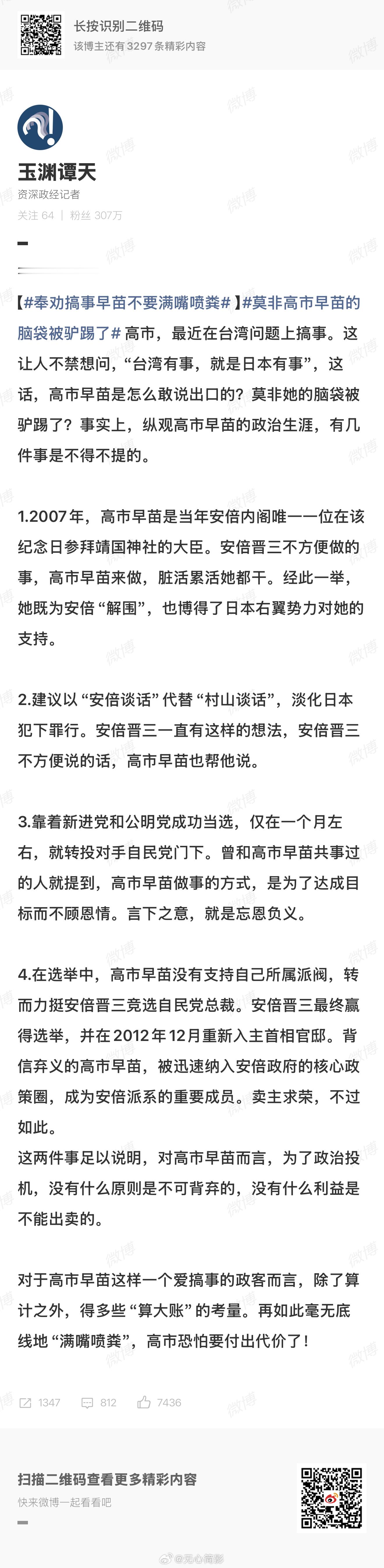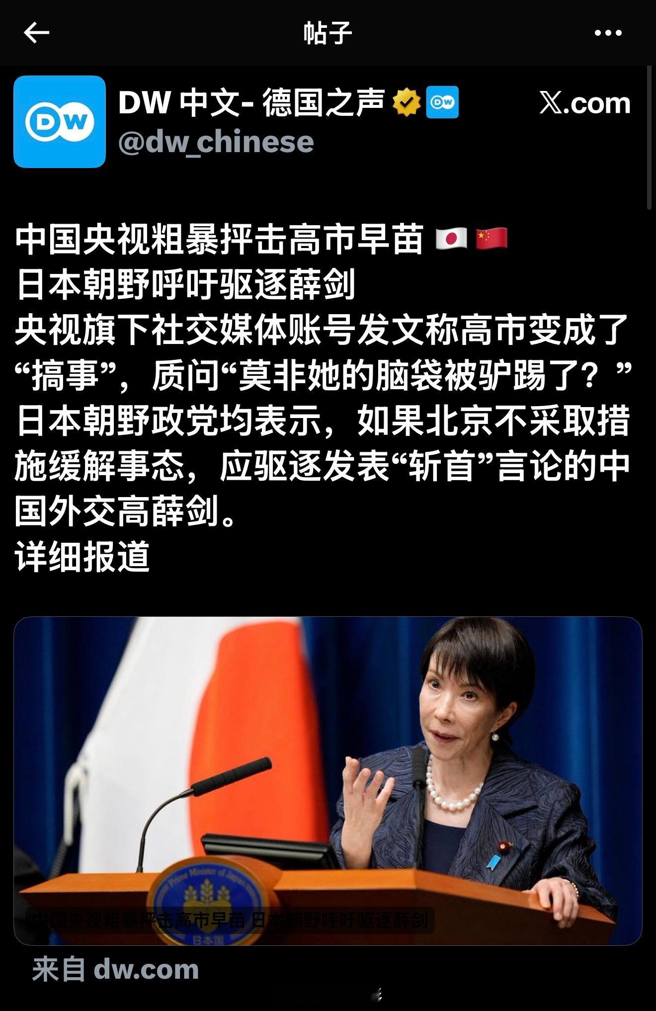 德媒DW的蛙编拱火来了~在总台旗下的玉渊谭天质疑 ,以及 后,由台湾人控制的DW中文版评论这是“央视粗鲁抨击高市早苗”,并表示“日本外务省尚未立即回应媒体的置评请求。”(看来已经去问了外务省“你怎么看中国媒体说你们首相脑袋被驴踢了?”)哈哈哈哈哈,高市早苗当局是两头堵啊,她们自己是想灭火的,都已经放话找补了,结果下面的各右翼党派成员不乐意,要求她对华强硬,中方这边也不惯着,现场教学“薛剑总领事那几句真不算啥”,期待明天外务省和日本各媒体的回应,不要让我们“失望”哦。