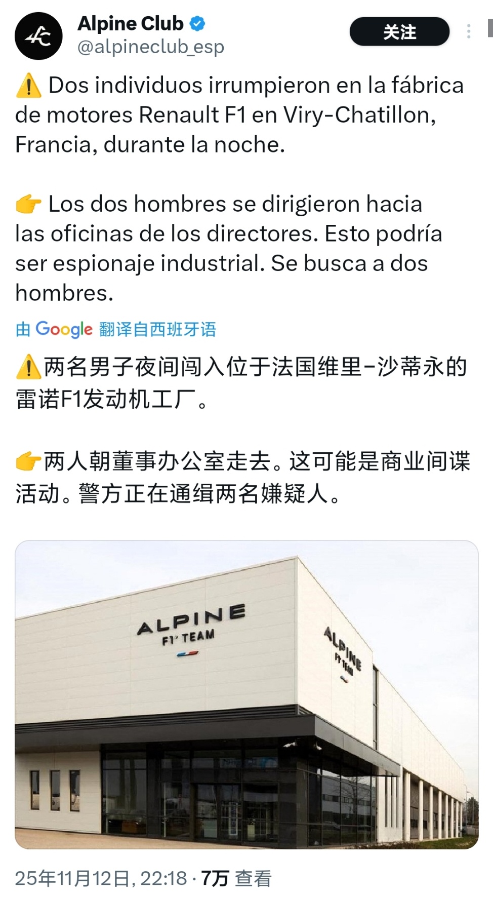 ? 两名男子破窗闯入Alpine F1车队(雷诺)位于法国🇫🇷维里沙蒂永的引擎研发工厂,两人在那里只待了五分钟,期间去了公司高管和管理层办公室,并没有盗走任何财务,猜测这可能是商业间谍行为,目前警方正在通缉这两位嫌疑人。如果真的奔着引擎去的……福特(红牛)、奥迪、凯迪拉克 who❓(梅奔、法拉利和本田应该最用不着吧)