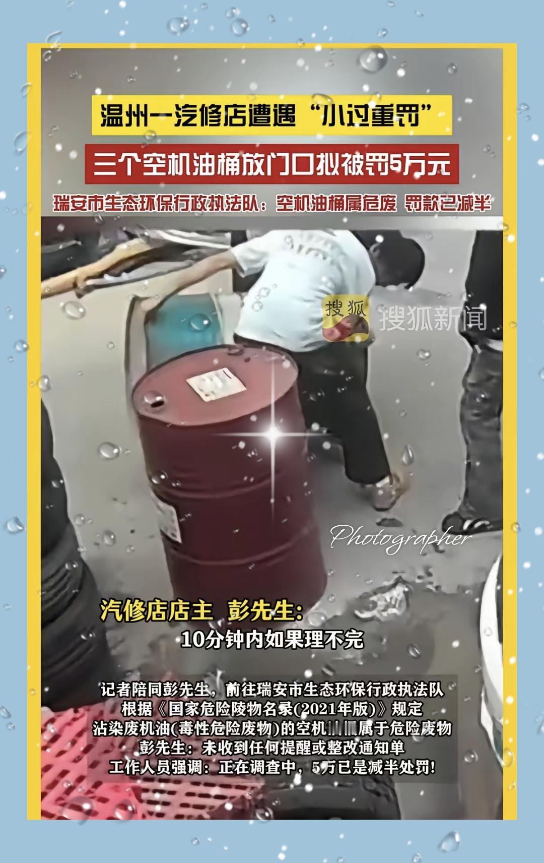 三个空机油桶,罚5万?这听起来像是个段子,但它真实发生在温州一位汽修店老板彭先生身上。 事情很简单:彭先生正在给店里刷地坪漆,临时把几个空机油桶挪到门口,打算半天内就搬回去。 结果执法人员上门,二话不说开出10万元罚单,随后“好心”减半到5万,要求当场签字。彭先生恳求给10分钟整改,却被拒绝,理由是“规章制度就是这样”。 这事儿一曝光,网上炸开了锅。有人说“法不容情”,危废就得严管;更多人则觉得,这罚得太重、太机械了——一个小本生意,几个月利润可能都不到5万,而且人家不是故意乱扔,只是临时堆放,还主动要求整改。 其实,法律早就说了,处罚要和情节、危害程度相当,还要坚持“教育与处罚相结合”。像这种首次、轻微、能即时整改、没造成实际污染的情况,很多地方都推行“首违不罚”或“轻微免罚”。可到了这里,怎么就变成“要么签字罚5万,要么不签罚10万”的二选一了? 执法不是为了“以儆效尤”就可以不讲理。真正的法治,应该是既有力度,也有温度。如果连10分钟的整改机会都不给,只会让人心寒,也背离了执法的初衷。 你觉得,三个临时堆放的空机油桶,该罚5万吗?如果是你,会签字吗?