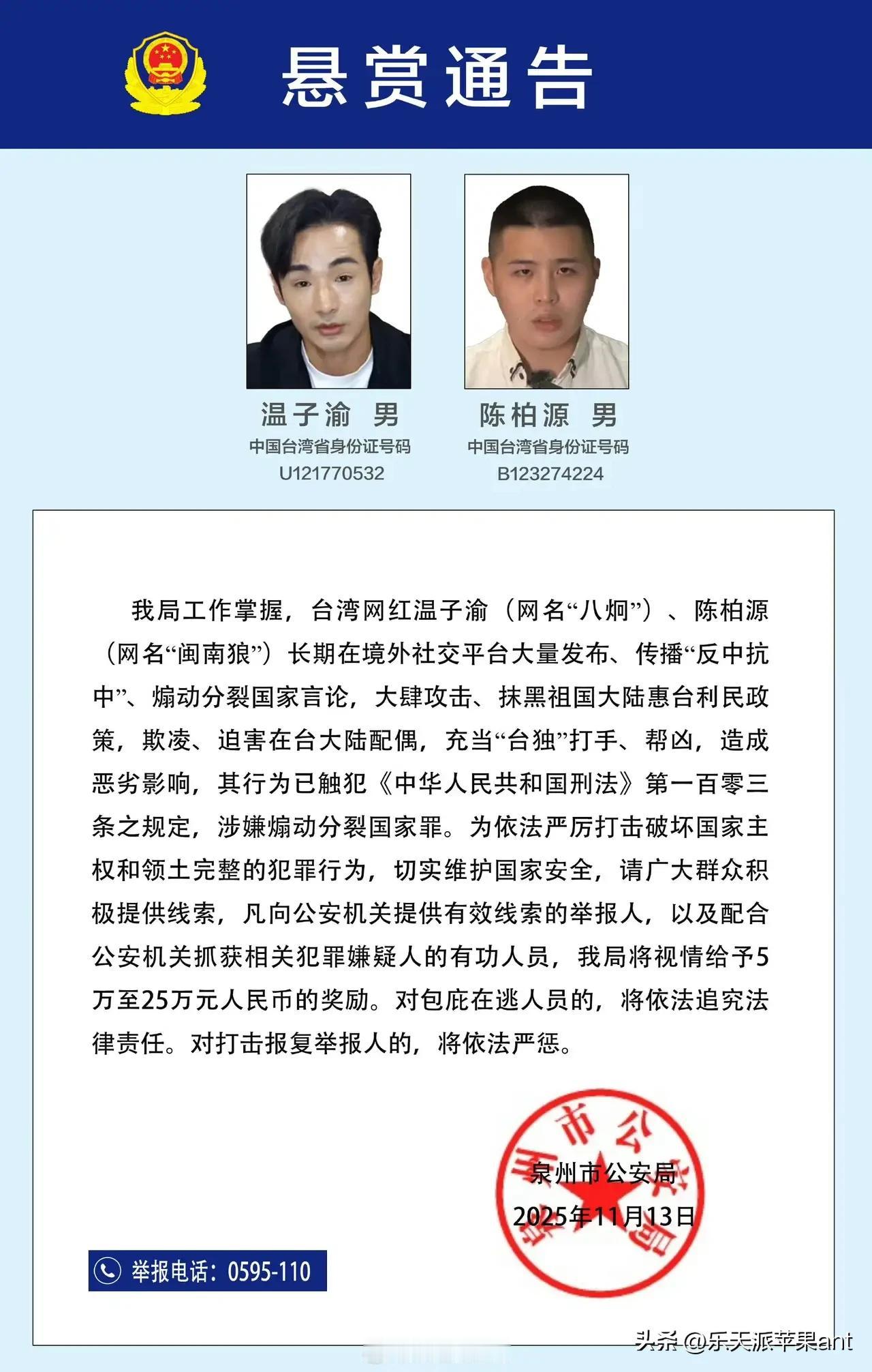 悬赏5万到25万!2名台湾网红因"台独"行径被全网追查,罪证太恶劣 11月13日,福建泉州公安的一则悬赏通告刷爆全网!台湾网红温子渝(网名"八炯")、陈柏源(网名"闽南狼")因长期煽动分裂国家,被公开征集违法犯罪线索,协助抓获者可获5万至25万元奖励。 这两人早被国台办点名列为"台独"打手,恶行罄竹难书:一边喊着"抗中保台""倚美谋独"的谬论,抹黑大陆惠台政策;一边霸凌在台陆配,围堵叫骂、上门骚扰,逼得当事人关闭账号离台。更离谱的是,他们还编造"20万台湾人领大陆身份证"的谣言,甚至效仿纳粹操控民众情绪,连民进党都曾为其开脱。 "台独"从来都是死路一条!此前"八旗文化"总编辑李延贺、"台独"分子杨智渊,都因分裂国家罪获刑。现在公安机关亮剑,正是要让所有分裂分子知道:任何分裂国家的行径,都逃不过法律制裁。 欢迎大家积极提供线索,一起抵制"台独",守护国家主权和领土完整!