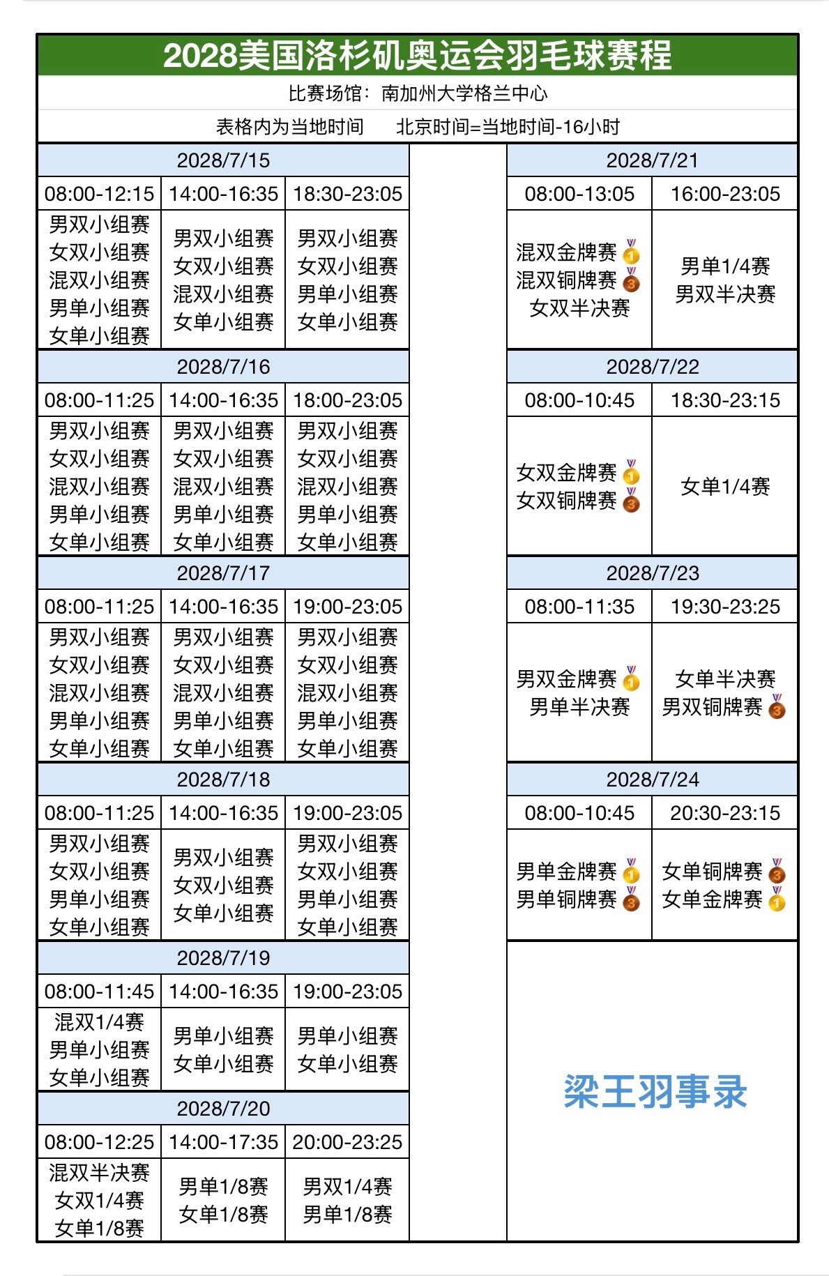 2028洛杉矶奥运会羽毛球赛程比赛时间:2028/7/15-2028/7/24整