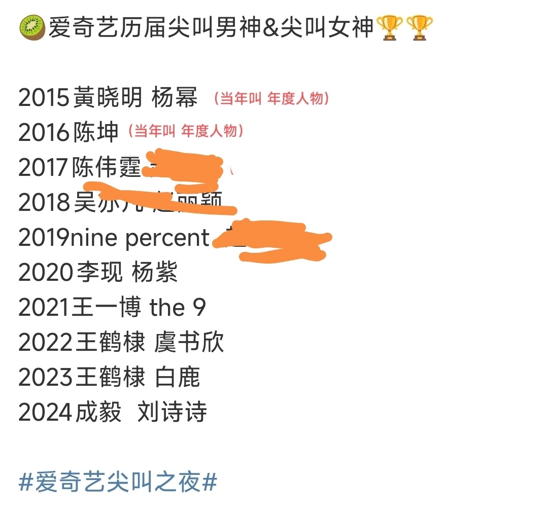 这个才对:2015年 杨幂 黄晓明。2016年 陈坤。那时候爱奇艺尖叫之夜只有“年度人物”作为尖叫男神女神的。