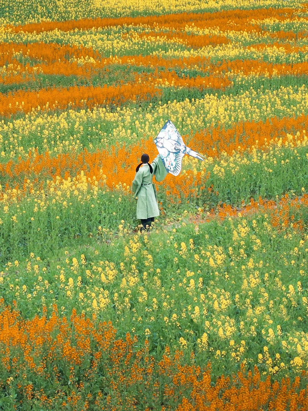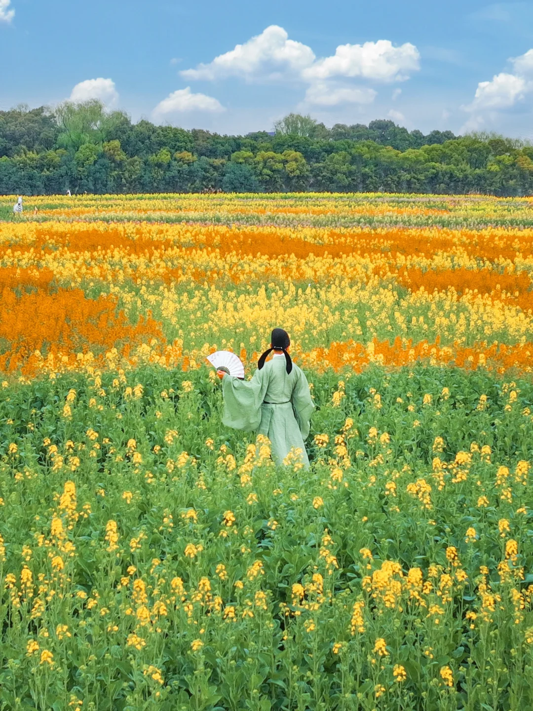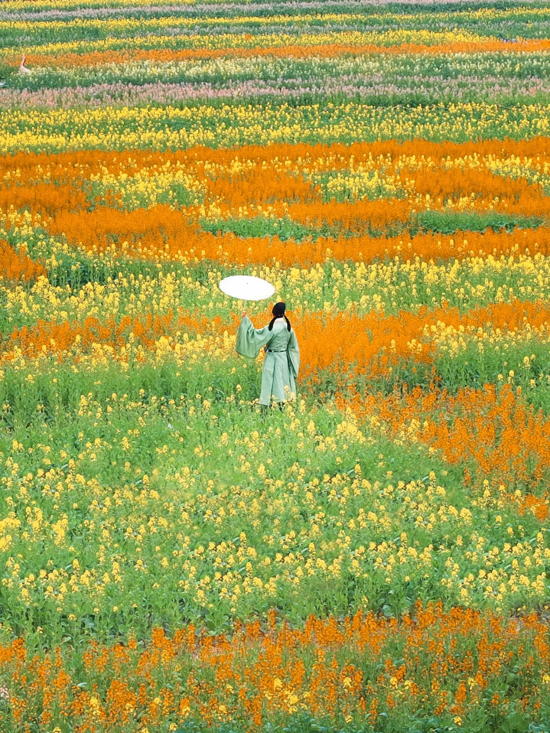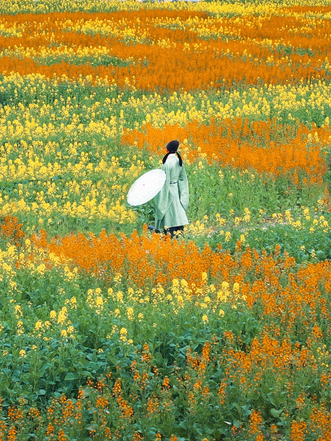 3月下旬至4月,七彩油菜花田如彩虹坠落人间,粉、紫、白、黄交织成莫奈花园,随手一拍即是大片