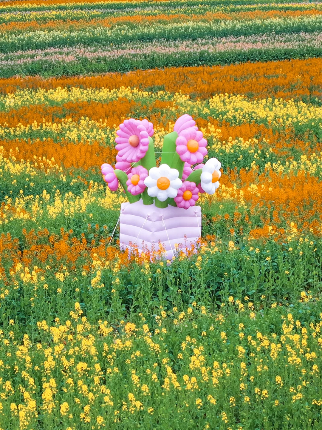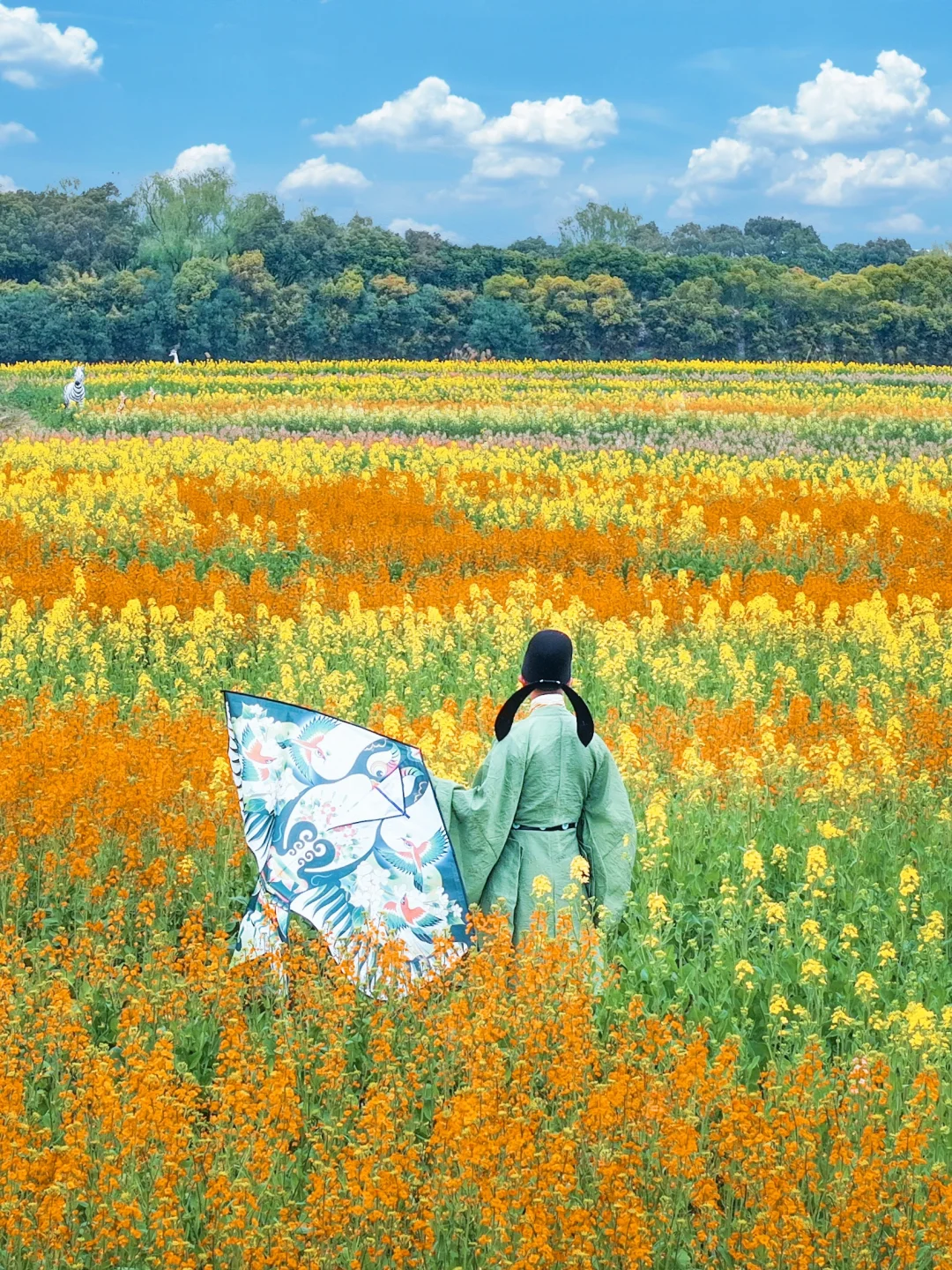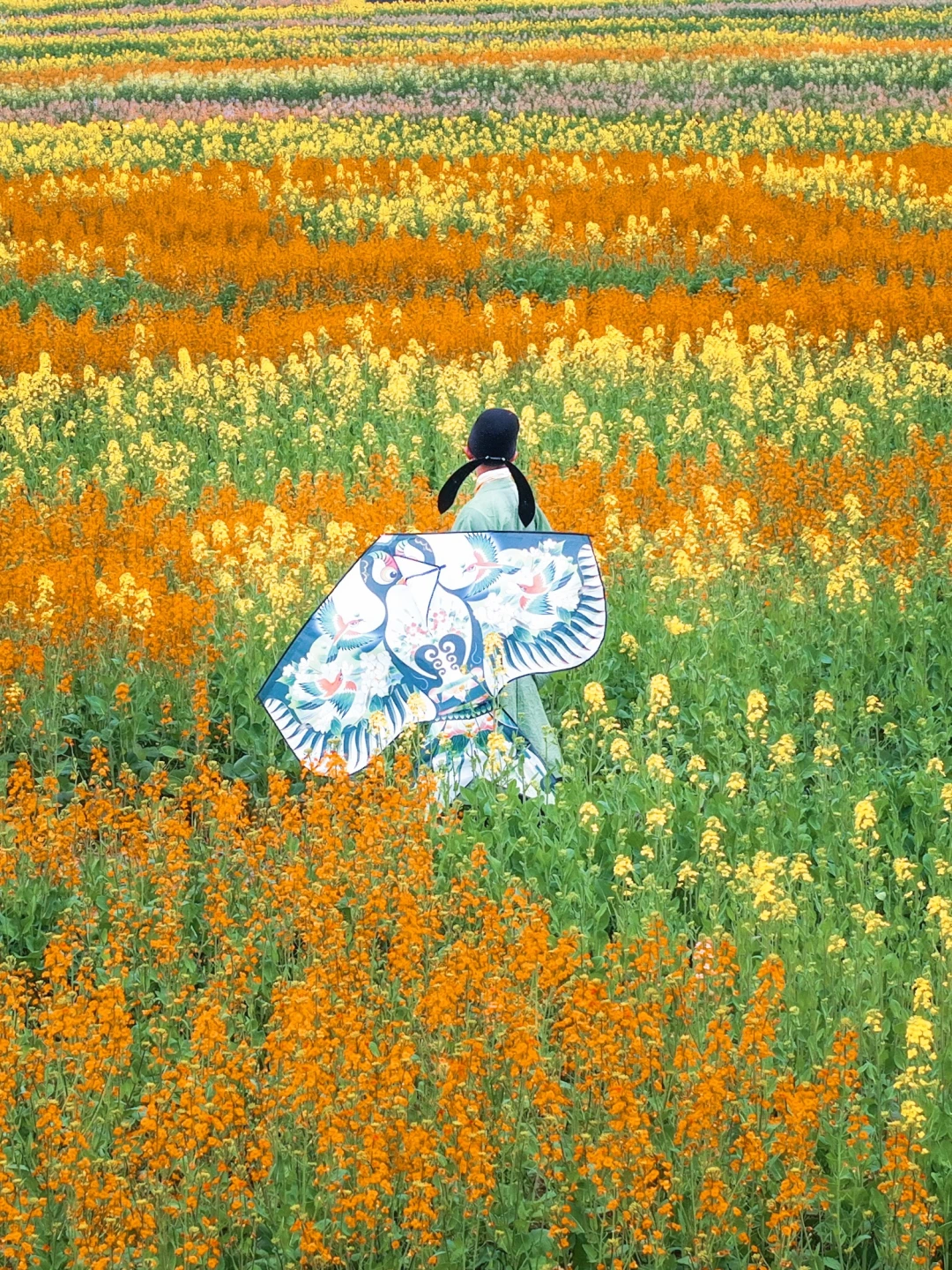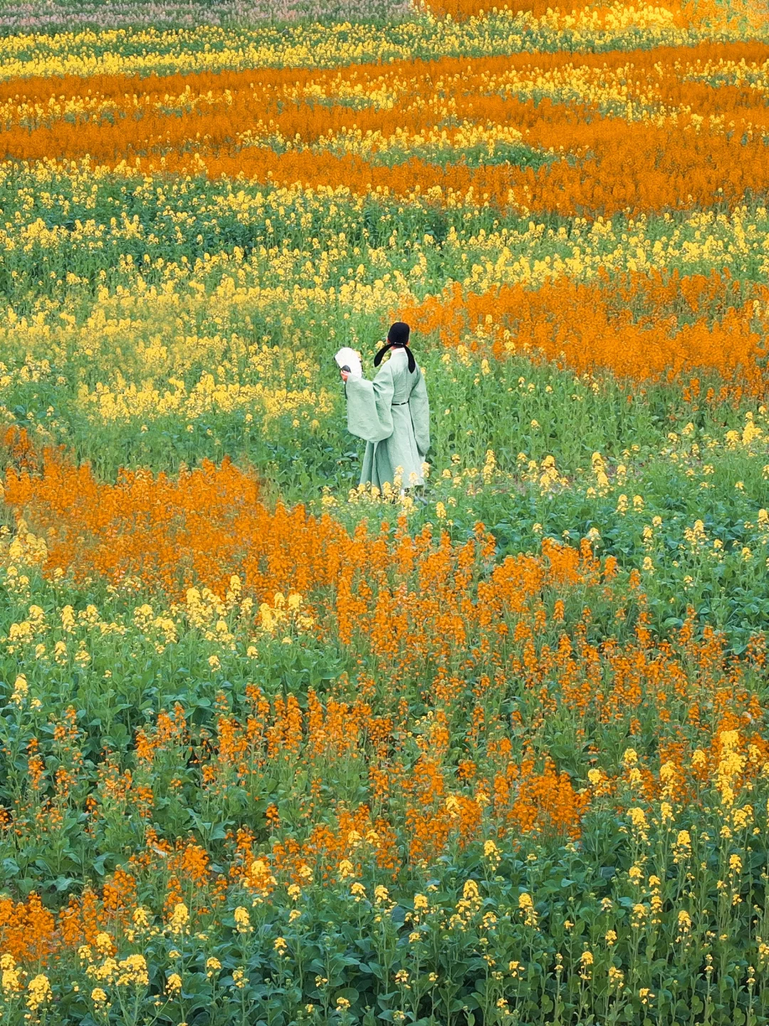 3月下旬至4月,七彩油菜花田如彩虹坠落人间,粉、紫、白、黄交织成莫奈花园,随手一拍即是大片