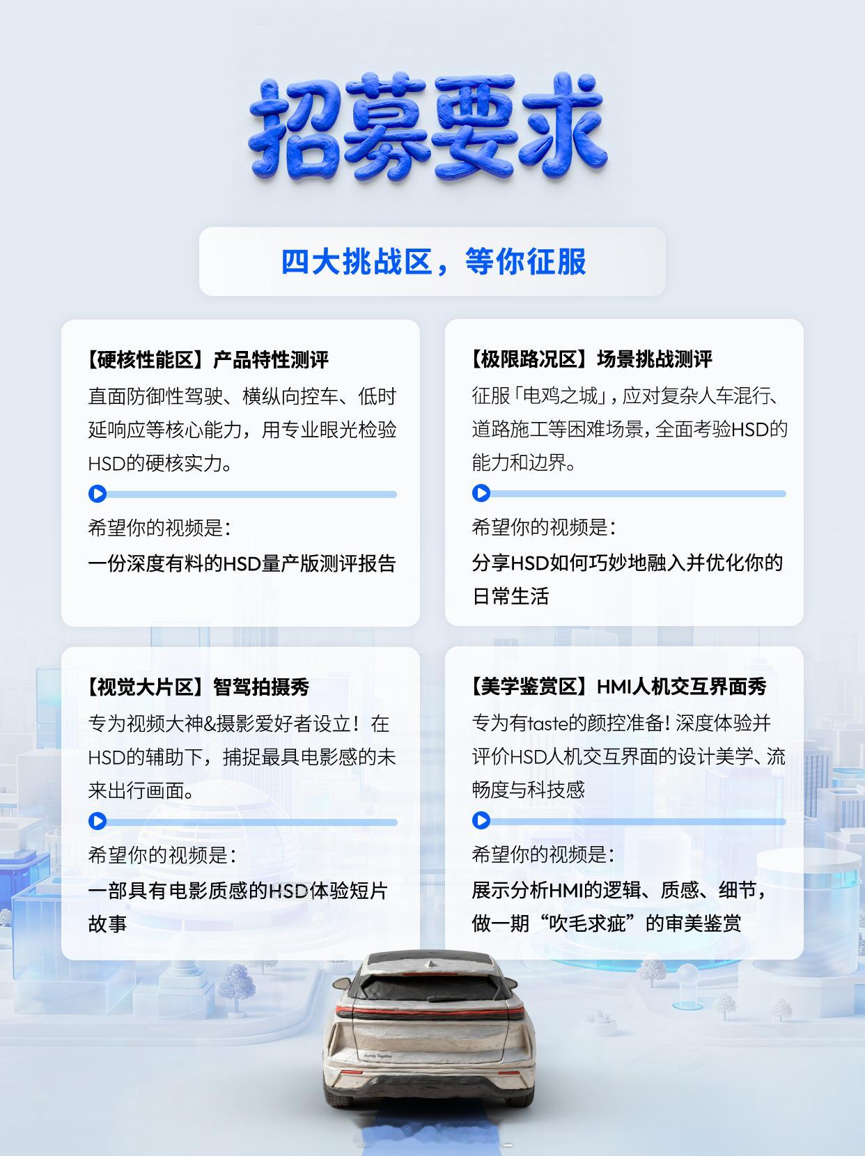 有没有智驾发烧友的同学,想体验地平线HSD量产版,大家可以直接私信我这次代表地平线发起招募,听说还有3万奖金可以瓜分:【硬核性能区】产品特性测评【极限路况区】场景挑战测评【视觉大片区】智驾拍摄秀【美学鉴赏区】HMI人机交互秀如果你能输出一份有深度、有料的HSD量产版体验测评报告,可以直接报名。