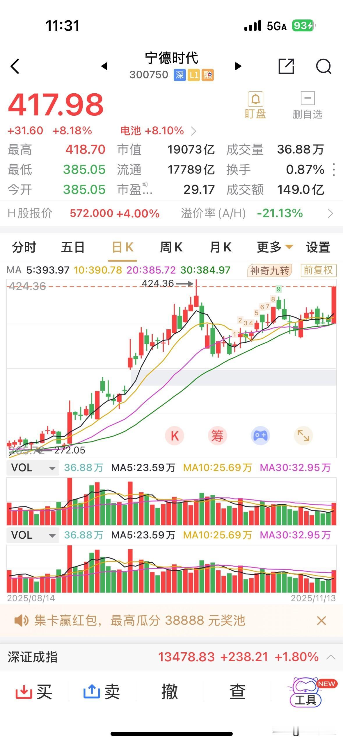 宁德时代距离新高仅一步之遥,早盘成交149亿元,而我竟然在昨日尾盘毅然清空了,这种痛苦,谁懂?!虽然仓位仅3手,但3手也是钱啊[捂脸][捂脸][捂脸],毕竟大涨8%,在A股市场果然只能赚认知范围内的钱。 宁王折腾了一个月,盯盘盯着眼花,仅小赚几千元,还不如一个午休,安睡到到收盘! 这敢追吗,呵呵!
