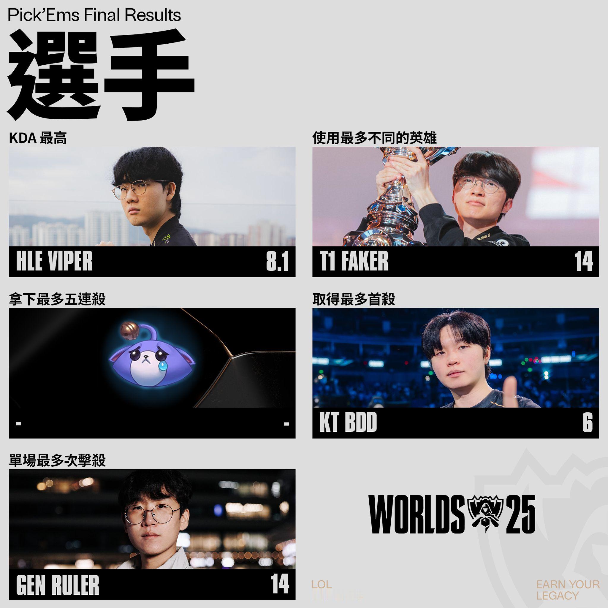 官方发布S15选手最终数据:KDA最高:Viper 8.1使用最多不同英雄:Faker 14五杀:0最多一血:Bdd 6单场最多击杀:Ruler 14