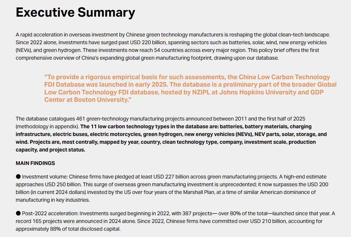 英国政治经济学家 • 剑桥大学助理教授约斯坦·豪格援引“净零工业政策实验室”的信息发文称:自2022年以来,中国在全球的绿色制造投资总额已超过2100亿美元。 经通货膨胀调整后,这比美国在二战后投入的马歇尔计划还要多。在约斯坦·豪格引用的文章中提及:“为了为此类评估提供严谨的实证基础,中国低碳技术外国直接投资数据库于 2025 年初启动。该数据库是更广泛的全球低碳技术外国直接投资数据库的初步组成部分,该数据库由约翰霍普金斯大学的 NZIPL 和波士顿大学的 GDP 中心托管。该数据库编录了 2011 年至 2025 年上半年宣布的 461 个绿色技术制造项目(方法见附录)。数据库中的11种低碳技术类型分别是:电池、电池材料、充电基础设施、电动公交车、电动摩托车、绿氢、新能源汽车(NEV)、新能源汽车零部件、太阳能、储能和风能。项目最集中的是按年份、国家、清洁技术类型、公司、投资规模、生产能力和项目状态绘制的地图。中国绿色技术制造商海外投资的迅速加速正在重塑全球清洁技术格局。仅自 2022 年以来,投资就飙升至 2200 亿美元以上,涵盖电池、太阳能、风能、新能源汽车 (NEV) 和绿色氢能等领域。这些投资现在覆盖了每个主要地区的 54 个国家。本政策简报利用我们的数据库首次全面概述了中国不断扩大的全球绿色制造足迹。主要发现● 投资额:中国企业已承诺在绿色制造项目上投入至少2270亿美元。高端估计接近 2500 亿美元。海外绿色制造投资的激增是前所未有的;现在,它超过了美国在马歇尔计划四年内投资的 2000 亿美元(按当前 2024 年美元计算),而此时美国在关键行业的制造业中也占据了类似的主导地位。● 2022 年后加速:从 2022 年开始,投资激增,自当年以来启动了 387 个项目,占总数的 80% 以上。仅 2024 年就宣布了创纪录的 165 个项目。自2022年以来,中国企业已承诺超过2100亿美元,约占披露资本总额的88%。 通过这篇西方视角下的文章,更能说明中国在“碳达峰、碳中和”的气候应对措施上是全世界做得最好的国家,那么毫无疑问也必然会获得因此巨大投入后带来的更多收益,曾经尼古拉特斯拉(不是埃隆的那个特斯拉)无法实现的壮举,现在由中国人实现!