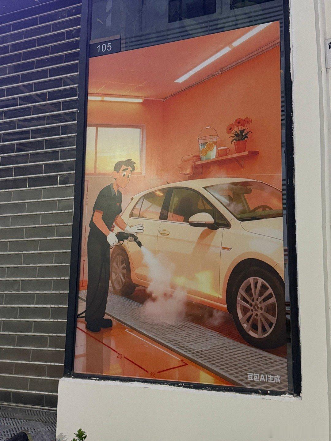 拿AI图来做宣传的话,还是仔细检查一下吧……洗车店门口一副巨大的画,洗手小哥左手