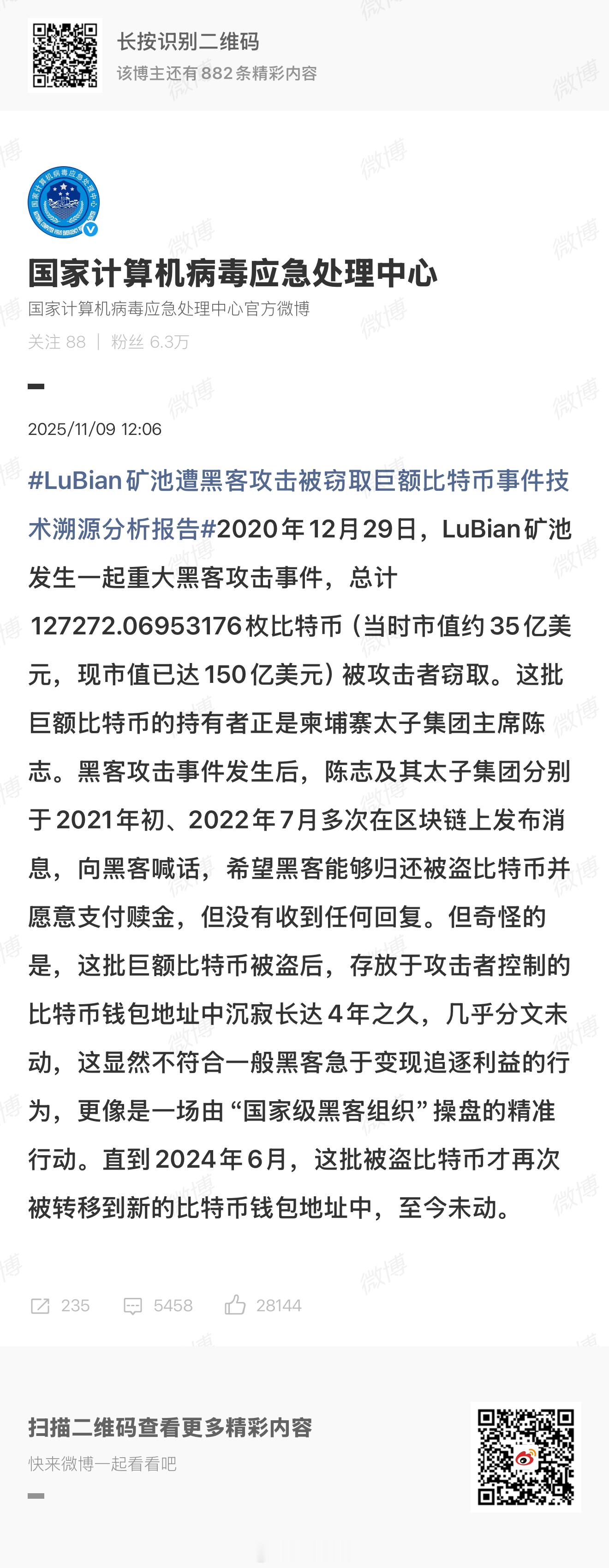 还记得上个月,特朗普一个帖子让比特币暴跌,150万人爆仓的事情吧?今天彭博社发了篇文章,说自那以后,比特币市值在“艰难复苏”,在10万美元上方震荡,主要原因是机构大户们都被割怕了,大资金纷纷退场。但这篇文章写到后面,又开始“乐观”起来,说10月事件是“必要重置”,可能为Q4反弹铺路。好家伙,这是还没割够的意思,媒体打窝来了。不过美国网上虽然一堆帖子指控特朗普家族操控市场,一堆说要上天台的人,但还是有人在鼓吹“幸存者将致富”,说要“坚持下来”。思配苦了属于是。再看看国家计算机病毒应急处理中心前两天发的帖子 。(图3、4)美国被爆出2020年从 LuBian 矿池窃取价值150亿美元的比特币,这批比特币属于柬埔寨太子集团主席陈志。到了2025年,美国司法部才跳出来起诉陈志,说把这批比特币没收了。虽然陈志这货活该,但美国这手养肥了再黑吃黑确实让人开眼界。比特币号称去中心化,结果美国想窃取就窃取,想控盘就控盘,完全是自家后花园想咋玩咋玩。你手里的比特币,美国随时能通过各种手段抢走,这哪是去中心化,明明是 “美国中心化”。