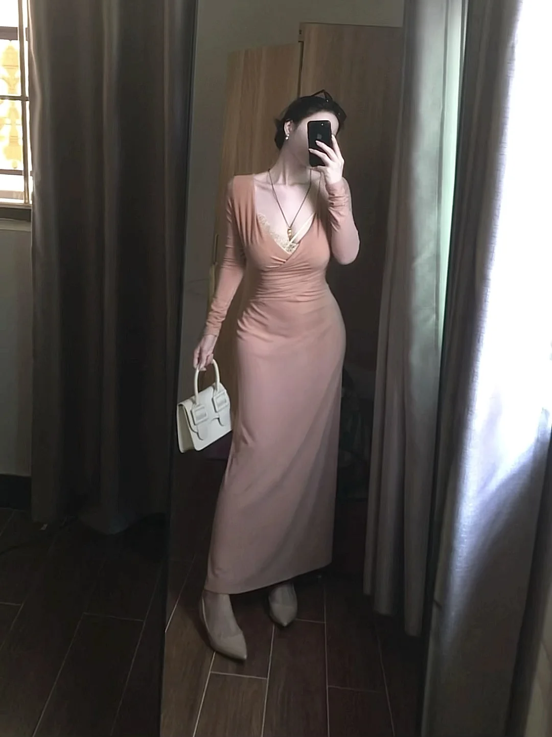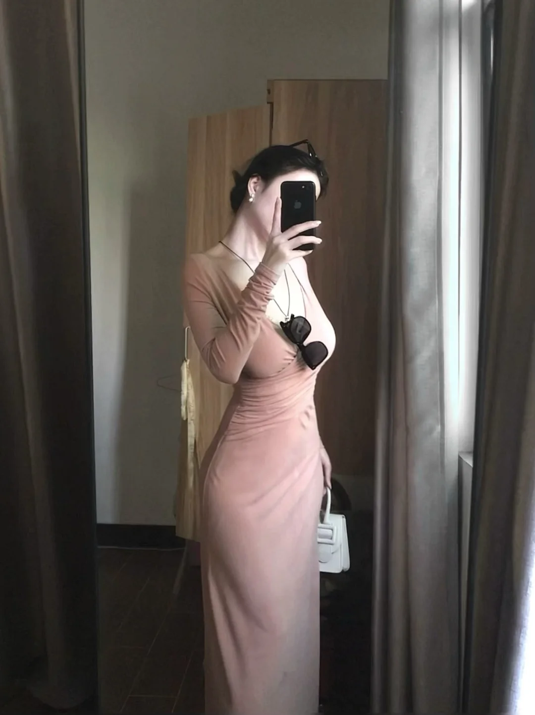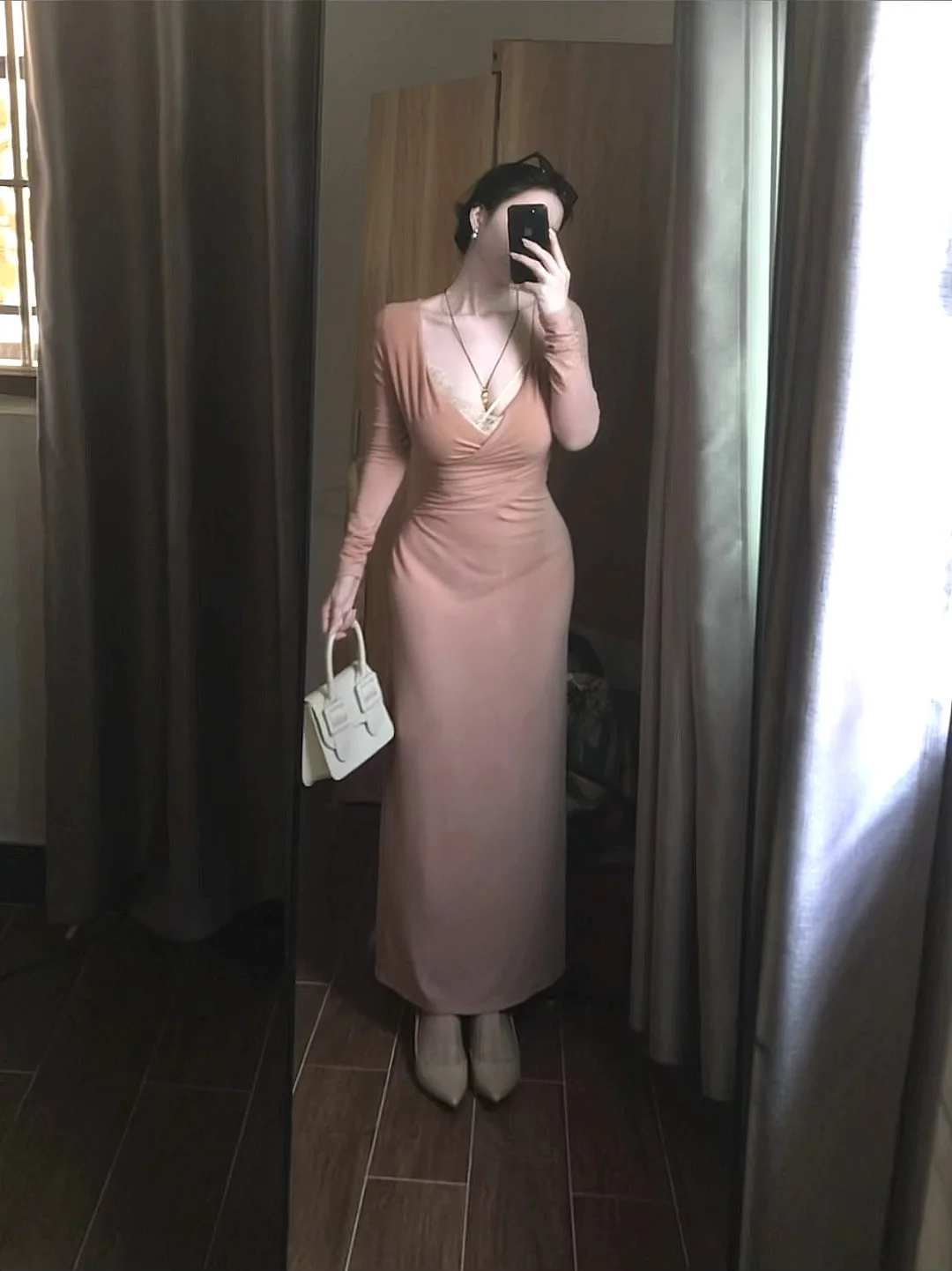 优雅气质穿搭,裸色高跟鞋搭配浅灰色连衣裙,尽显都市女性魅力