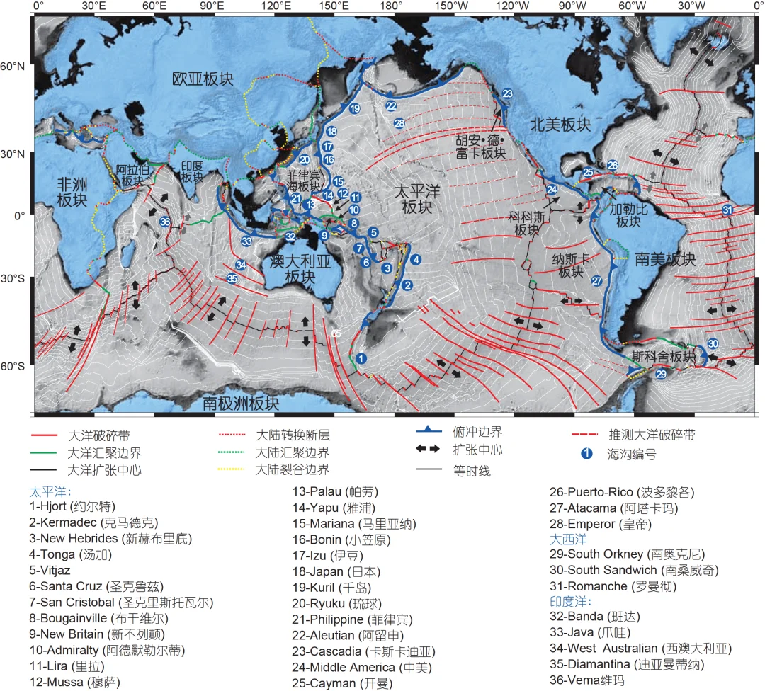 🌏全球海沟长度大约55000km。与洋中脊60000km的总长度相当,全球有37条深海沟(图2), 长度从300km(东吕宋)到2700km(阿留申-阿拉斯加)不等, 5条分布在大西洋, 4条分布在印度洋, 28条分布在太平洋(图2).