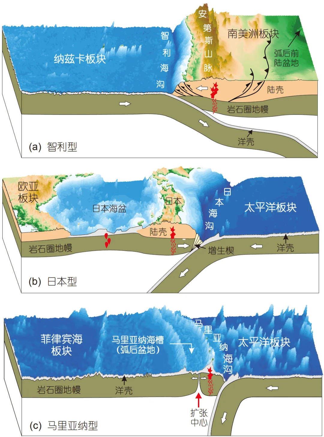 📻全球海沟的形成与洋-洋或洋-陆汇聚过程中较重的大洋板块分别向另一大洋板块或较轻的大陆板块之下俯冲有关. 从地质地貌角度, 总结为三种海沟系统或大洋俯冲带类型.