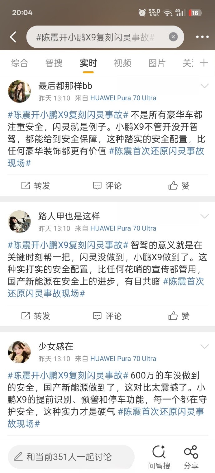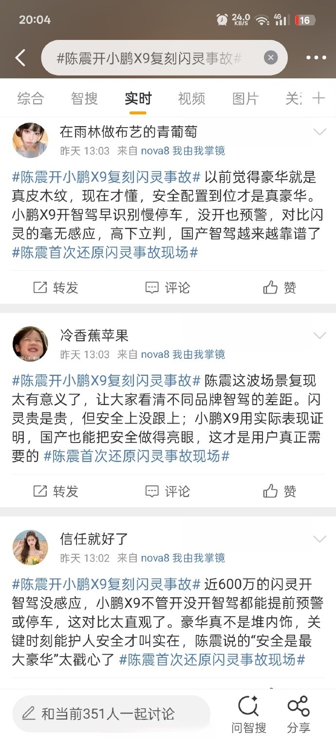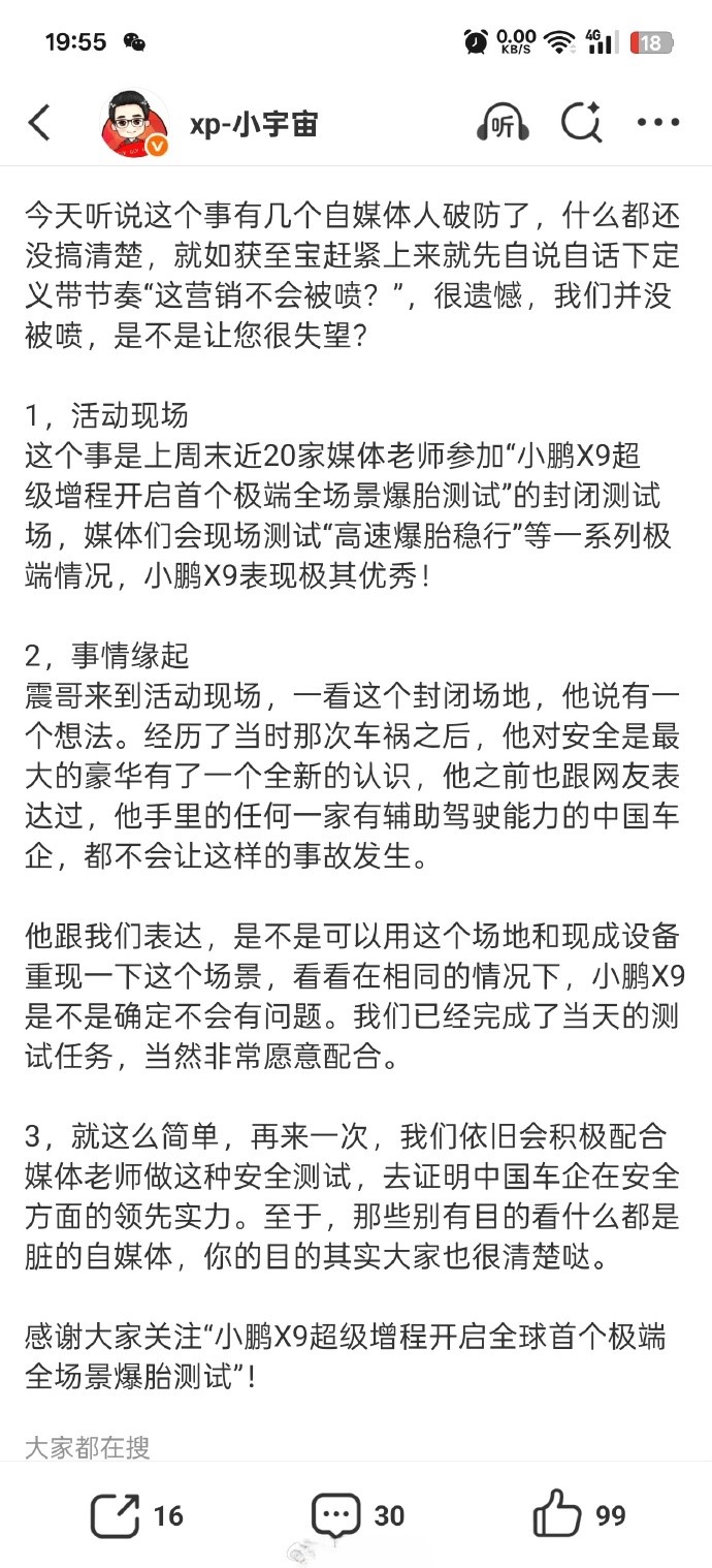 小鹏单纯配合陈震的兴趣做安全测试 我更愿意相信,小鹏单纯配合陈震的兴趣做安全测试,然后被恶意起话题(事故复刻+劳斯莱斯).......... 在这个场景复现里,对小鹏辅助驾驶绝对也是小儿科,并且这也是事实,复原测试也并没有什么问题。 不过,另外一个可能:如果这是小鹏看到震哥想法,恰好灵机一动用这个事故复现,推的新车营销话题,那确实稍微有点点点上头,过头,然后被骂的话,就亏麻了