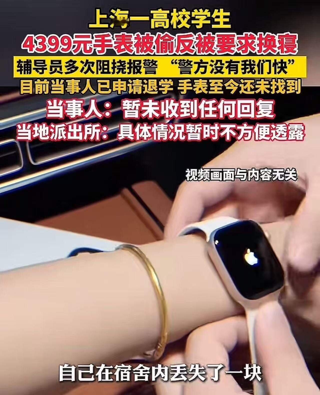 上海,女生价值4399元的苹果手表在宿舍离奇失踪,通过定位查询,手机最后出现的位置指向室友的床铺。可没想到女生报警时,被辅导员阻拦!更让女大学生无语的是,她的手表丢了,反而被要求换寝室! “你报警没有用的!”这句话似乎成了许多受害者心头的阴影。在上海某高校,一名大三女生遭遇了令人愤怒又无奈的事情:她心爱的苹果手表价值4399元,竟然就这样在宿舍里“蒸发”了。更令人震惊的是,经过定位追查,手机最后出现的位置直指室友的床铺。而当她满心期待通过报警找回“失踪的宝贝”时,迎来的却是一场荒谬的“阻挠”。 事情的经过让人心头一紧:女生第一时间拨打了110,描述失窃经过,希望警方介入调查。然而,辅导员的回应却让她目瞪口呆:“报警没用的,你们还是换寝室吧。”一句话似乎成了官方的“定论”,仿佛面对学生的合法诉求,学校只愿意选择“回避”而非“解决”。 这不仅仅是一起单纯的失窃事件,更折射出当下校园中一些令人深思的现实。为什么面对学生的合法权益,学校和相关部门反应如此消极?为什么一件价值不菲的财物丢失,竟要以换寝室来“解决”?这背后隐藏的,是对学生权益的漠视,还是一种“以和为贵”的无奈妥协? 更令人愤怒的是,这位女生的遭遇其实只是冰山一角。在许多高校,类似的事件并不少见。有的学生财物被盗,学校的回应从“报警没用”到“自己小心点”,似乎都在告诉他们:我们更关心的是“安稳”与“和谐”,而非真正解决问题的根源。这种态度,无疑在潜移默化中强化了“受害者自己要小心”的观念,而忽视了校园应有的安全保障和权益保障。 但问题的核心,远不止于此。或许,正是因为我们习惯了“事情就是这样”的态度,才让一些潜在的风险变得越来越大。校园不是法外之地,更不应成为“谁敢报警,谁就得忍受被打压”的场所。每一个受害的学生,都是社会正义的前线战士。他们的声音,是对那些冷漠和推诿的最有力反击。 我们不禁要问:当一个年轻的生命在校园里感受到如此冷漠和无助时,谁来为他们撑起一片安全的天空?当“报警没用”成为一种潜规则,校园的安全感又在哪里?更重要的是,社会和学校的责任不是用一句“换寝室”或“自己小心点”来应付,而是要真正行动起来,建立起让每个学生都能安心学习、自由成长的环境。 这场“苹果手表”的失踪事件,不仅仅是一次简单的失窃,更是一面镜子,映照出我们对校园安全、学生权益的态度。希望每一位读者都能从中看到一股力量——那就是,正义不应被忽视,保护学生权益的呼声绝不能被压制。只有我们共同努力,用行动去改变,才能让校园成为真正的温暖港湾,而不是冷漠的漩涡。宿舍手表 宿舍丢手表 宿舍偷手表 苹果电脑丢失