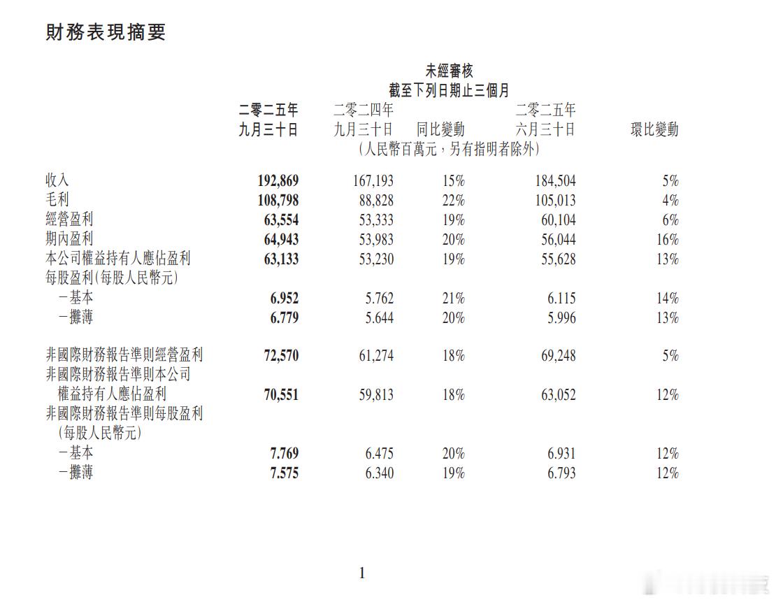 【】11月13日,腾讯控股在港交所公告称,第三季度营收1928.7亿元,同比增15%,预估1888亿元,上年同期1671.93亿元;第三季度净利润631.3亿元,同比增长19%,预估558.8亿元。腾讯控股第三季的非国际财务报告准则本公司权益持有人应占盈利同比增长18%至人民币706亿元。各位网友,您怎么看?(财联社)