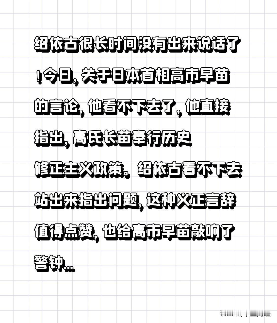 【历史修正主义】绍依古很长时间没有出来说话了! 今日,关于日本首相高市早苗的言论,他看不下去了,他直接指出,高市早苗奉行的是历史修正主义政策。 绍依古看不下去站出来指出问题,这种义正言辞值得点赞,也给高市早苗敲响了警钟,别再做相互矛盾以及干涉他国内政的荒唐事。