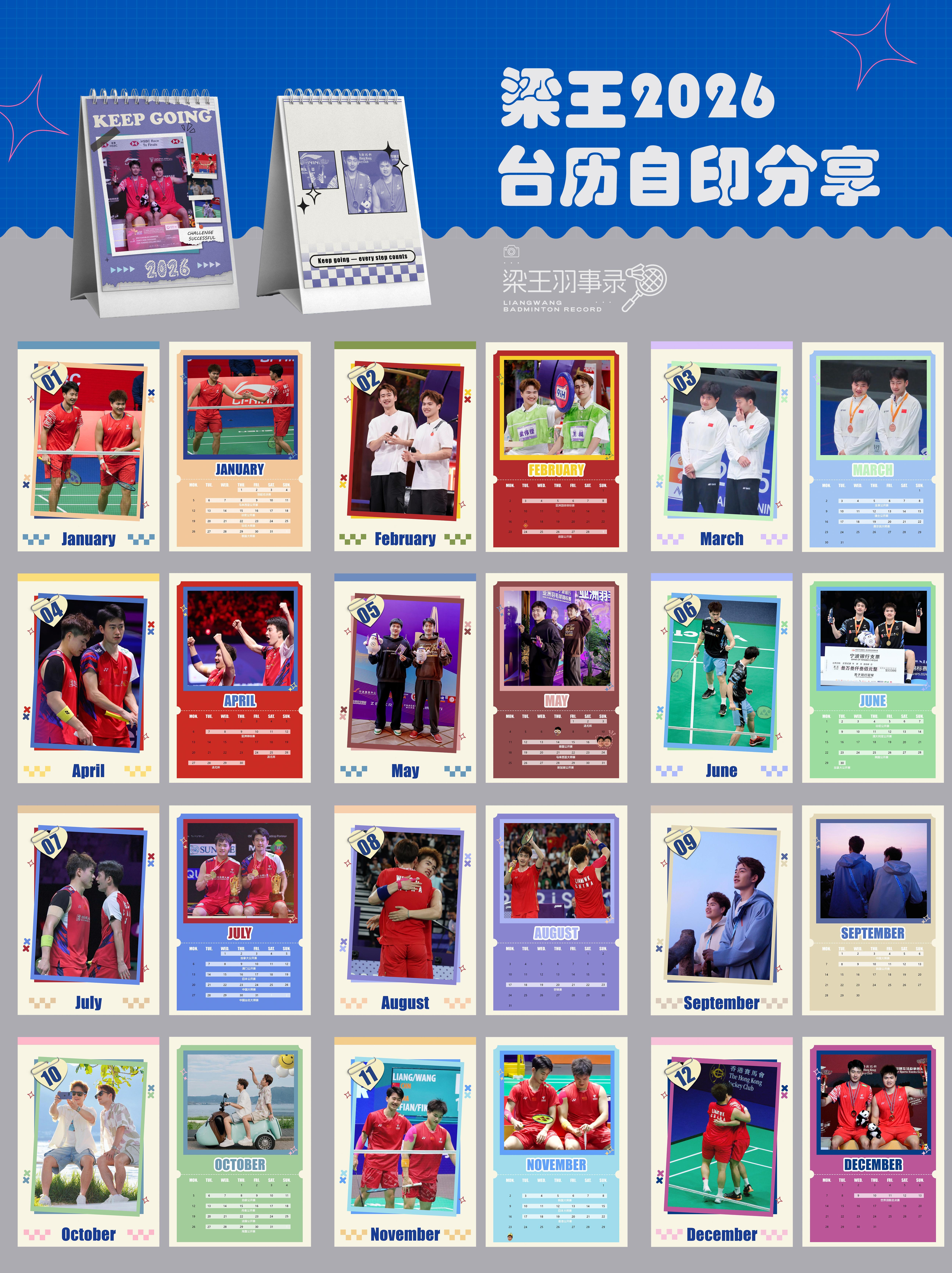 hello大家好!我做了2026的台历分享给大家自印~台历上标了目前BWF目前已经公布的赛事日期(S300及以上),未公布日期的大家可以自己后期手动标注领取要求:1. 梁王组合球迷2. 未辱骂过两人中任何一人如果有喜欢的朋友,可以私信我,看完主页后会发链接,如果未回复即为不通过台历禁止商用感谢大家