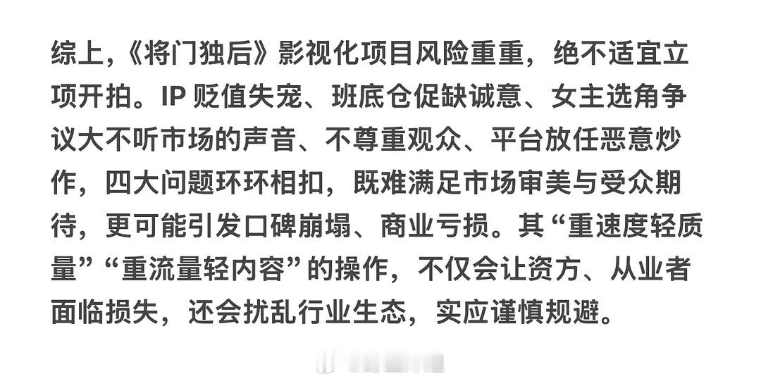 王鹤棣粉丝针对将门毒后影视化发表长文