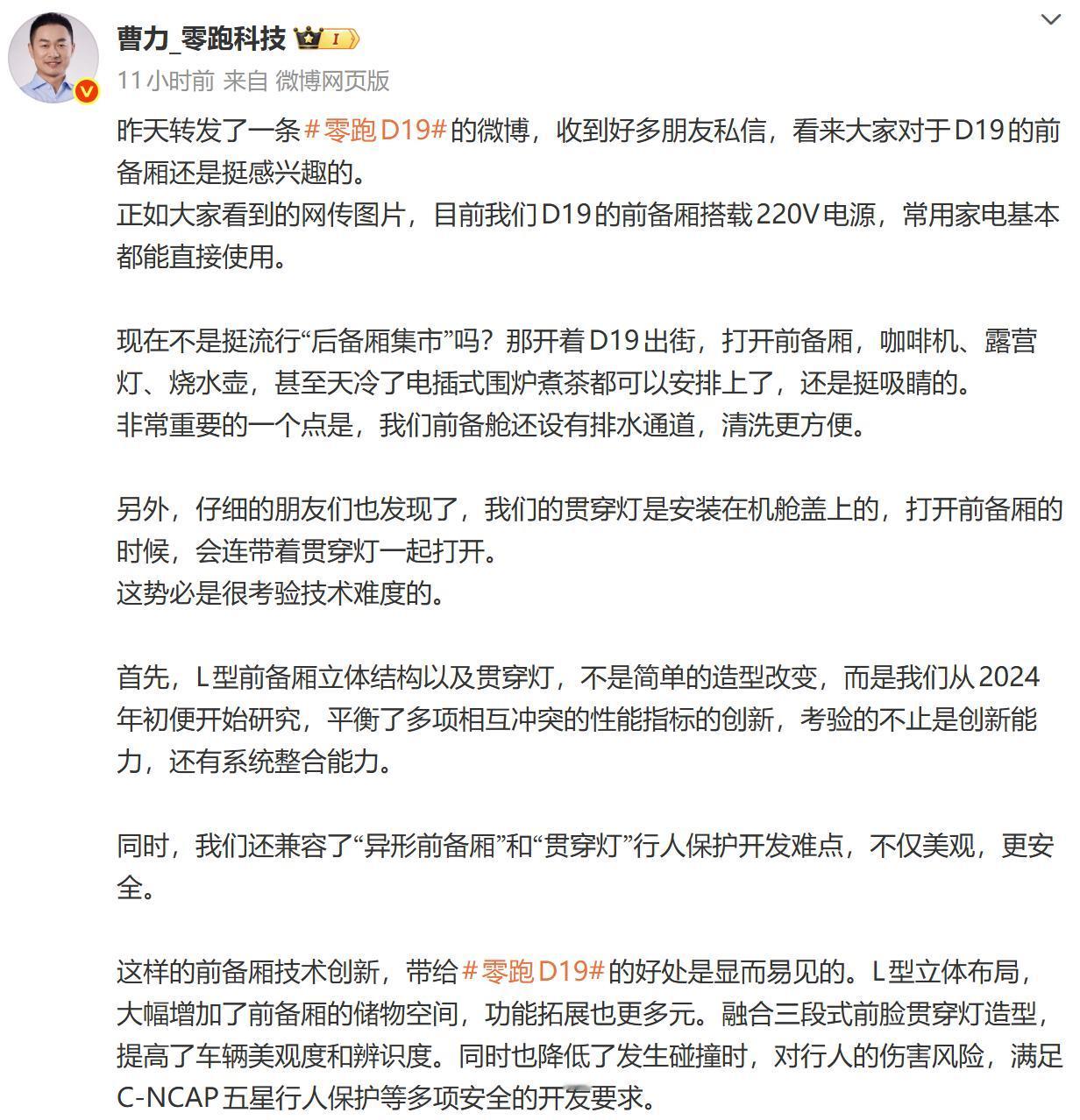 “百变厨房”,零跑的这个前备箱最近几天传播效果不错啊。 一个大胆创新且很实用的案例。 搭载了220V电源,大家常用的家电基本都能直接使用。咖啡机、露营灯、烧水壶等统统可以安排。 并且前备舱还设有排水通道,清洗更方便,这个很可能会成为一个爆点啊。你猜用户会怎么利用这个功能,是方便做饭的洗菜?还是钓鱼佬用来放战利品呢?