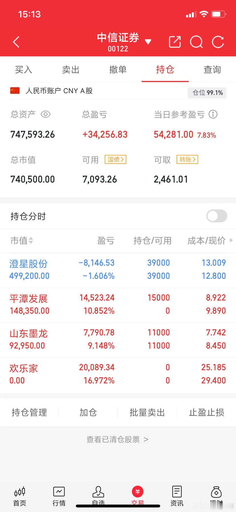 11.13持仓总结:平潭发展今日水下低吸建仓,午后成功封板,期待明日延续强势表现;山东墨龙上周布局,昨日斩获一板后,今日收盘仍录得5%涨幅,势头向好,盼明日再续升势;澄心股份继续持有观望,暂不调整策略。今日止盈欢乐家,落袋为安,留下的朋友祝一路长虹,继续吃肉!
