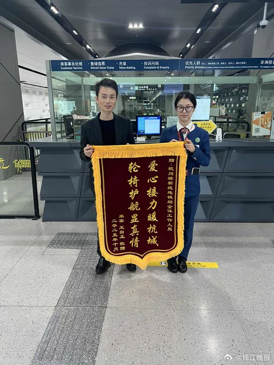 【 】90后新杭州人王先生,前段时间因为崴脚无法正常走路。一次在地铁站借轮椅的经历,却收获了42次工作人员暖心的出行陪伴。故事要从9月21日说起。当天21时11分,王先生脚受伤就医后,从奥体中心站打算乘坐地铁回家。一路上,王先生的妻子背着他,行走起来非常艰难。地铁站工作人员看到后,就推来轮椅护送他上车,并通知王先生所要去的目的地——塘新线站做好接力。在得知王先生每天需要乘坐地铁7号线,在塘新线站至萧山国际机场站通勤后,塘新线站的值班员邵佳明表示:“直接拨打我们车控室的电话,就有工作人员来帮您。”于是,9月22日起,塘新线站与萧山国际机场站联合组成了“爱心接送小组”。每个工作日早上8点左右,塘新线站工作人员护送他上车。等列车抵达萧山国际机场站,工作人员根据塘新线站同步的信息全程护送其出站。到了傍晚时分,这份守护又会反向延续。直到10月28日下班时,王先生对工作人员说:“今天应该是最后一次麻烦你们了,脚好得差不多了,后面我可以自己上下班了。”在一个多月的时间里,出发地和目的地站点的工作人员从未停止过这份守护,共协助王先生来回通勤42次。王先生还提到,坐在轮椅上时,会被工作人员的细致所感动,比如,出地铁站时有斜坡,他们就会慢慢地就把轮椅反方向转过来,确保平稳。在11月3日和7日,“老熟人”王先生专程带着锦旗,分别送至地铁塘新线站和萧山国际机场站,以此表达对地铁工作人员这些天来暖心服务的诚挚谢意。(潮新闻 记者 陈薇 通讯员 沈昱)