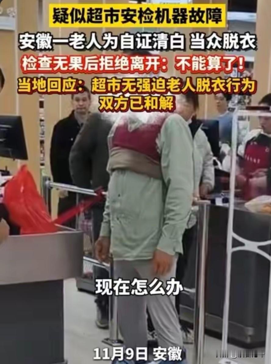 六旬老人超市脱衣证清白,只剩内衣裤时警报仍响,后续:警方通报双方和解,超市老板身份被扒! 欺人太甚!逛个超市还得脱衣服自证清白? 安徽一位六十多岁的老人,在超市购物后准备离开,安检门忽然报警,他出示购物小票解释无效,被店员拦下,最终六十多岁的大爷在众目睽睽之下脱得只剩内衣裤!就为了证明自己没偷东西! 这事儿是2025年11月9号发生的,地点在安徽合肥巢湖市柘皋镇,老人姓张,周边街坊都知道他是个老实本分的人。 张大爷那天买了点家常食材,微信付了钱攥着小票出门,安检门“滴滴”的警报声突然炸响,吓了他一跳。 当班的男店员立马冲过来,扫了眼小票就“哼”了一声,压根不听老人解释,一口咬定他藏了没结账的东西。 周围很快围满了人,有举手机拍照的,还有人低声议论,张大爷的脸瞬间红透,嘴唇哆嗦着说不出话。 他把布袋里的东西全倒出来,连老花镜、钥匙串都摆桌上,可一靠近安检门警报还响,店员居然说“说不定藏身上了”。 这话戳中了老人的底线,他活了六十多年从没被人这么污蔑过,急得当场就解外套扣子,一件接一件脱。 外套、毛衣、衬衫、秋衣扔了一地,最后只剩贴身内衣裤,后背的老骨头都露在外面,店员全程没劝阻,就站在旁边看着。 直到有热心大哥喊“别脱了”,又让空手的女店员试了试,安检门照样狂响,大家这才明白是设备坏了,有人赶紧报了警。 民警调取了3处监控,问了5位目击者,两小时就查清了真相:超市安检设备2016年购入,用了8年远超行业5-6年的更换周期。 而且这设备近3年没做过一次专业检修,店员也没受过误报处理培训,纯属超市疏忽导致的闹剧。 从法律上讲,《消费者权益保护法》第14条和第27条说得明明白白,经营者得尊重消费者人格尊严,不能搜查消费者身体。 超市让老人脱衣自证的行为,已经涉嫌侵权,根据《民法典》第一千零二十四条,必须承担赔礼道歉、赔偿损失的责任。 11月11号警方通报,双方已经和解,超市当面给张大爷赔了礼,赔偿了1500元,还承诺3天内更换设备。 超市老板也被网友扒了出来,是本地的个体工商户,这家超市开了好几年,居然连基本的设备维护都做不到。 更让人揪心的是,零售业数据显示,超市安检门正常误报率就有12%-18%,金属纽扣、手机都可能触发警报。 全国每年因安检误报引发的纠纷约3200起,83%都是设备老化、未定期检修或店员操作不当导致的。 张大爷之所以会用脱衣这种极端方式自证,就是因为他们这代人把名声看得比啥都重,“被怀疑偷窃”等同于人格被否定。 可超市呢?图省钱不检修设备,图省事不培训员工,出了问题就想一句“误会”打发人,这也太不负责任了。 虽然最后赔了钱、道了歉,但老人当众受的羞辱,心里的疙瘩哪能那么容易解开? 遇到这种事,咱真没必要学张大爷伤害自己,超市没有执法权,完全可以拒绝不合理要求,直接打110或12315投诉。 去年江苏苏州就有类似情况,大妈被冤枉后通过12315投诉,超市赔偿2000元还公开道歉,全程没起冲突。 超市作为服务行业,先核查设备和凭证才是该做的,上来就怀疑顾客,这是把“尊重”二字抛到脑后了。 各位读者你们怎么看?欢迎在评论区讨论。