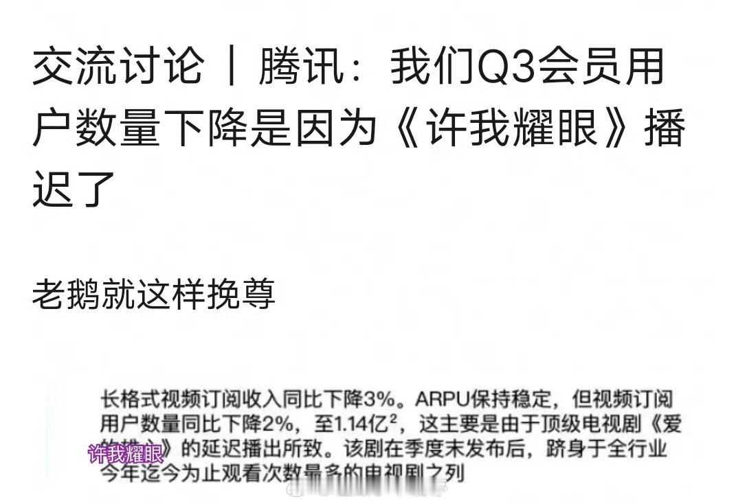 腾讯认为Q3会员用户数量下降,是因为赵露思的《许我耀眼》播迟了,赵露思的商业价值和剧粉盘就这样👍