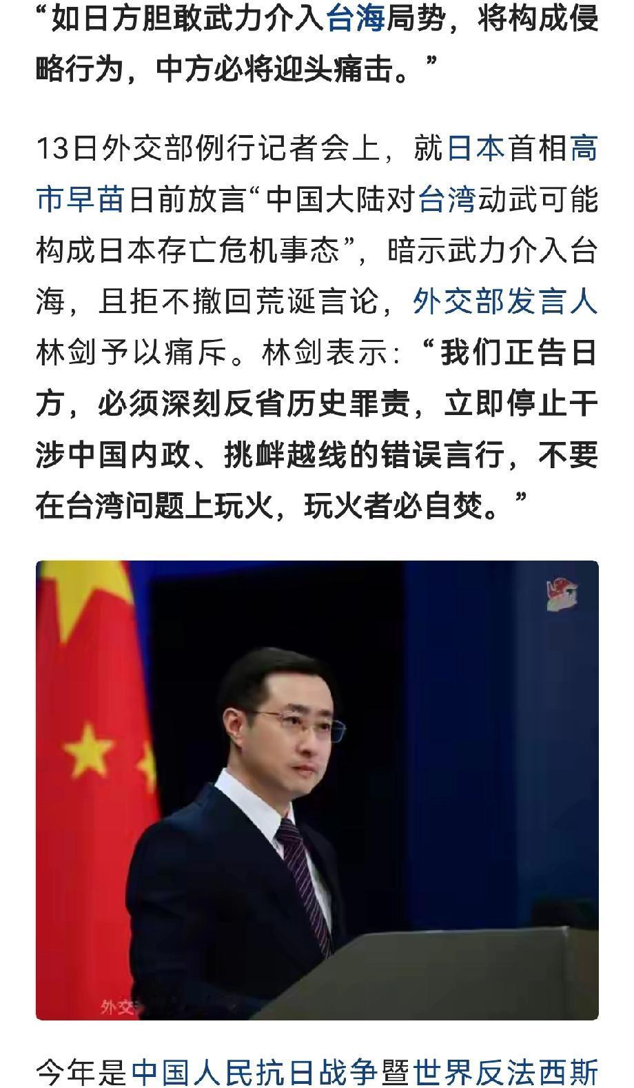 高市早苗被“点名”了,不要在台湾问题上玩火,玩火者必自焚! 近日日本首相高市早苗日前发表关于中国大陆对台湾动武可能构成日本“存亡危机事态”的言论。据报道,高市在国会答辩时称,有关言论符合日本政府看法,无意撤回或取消。 略抒己见:高市早苗是日本极右翼分子。她的这个涉台言论简直荒唐至极!作为日本首相,她忘了日本曾殖民台湾50年的罪行,如今还拿“存亡危机”碰瓷台海,明摆着是军国主义死灰复燃。台湾是中国内政,轮不到外人指手画脚,更容不得日方武力介入的妄想。《亮剑》里的“狭路相逢勇者胜”要勇于亮剑,才能给人痛击。