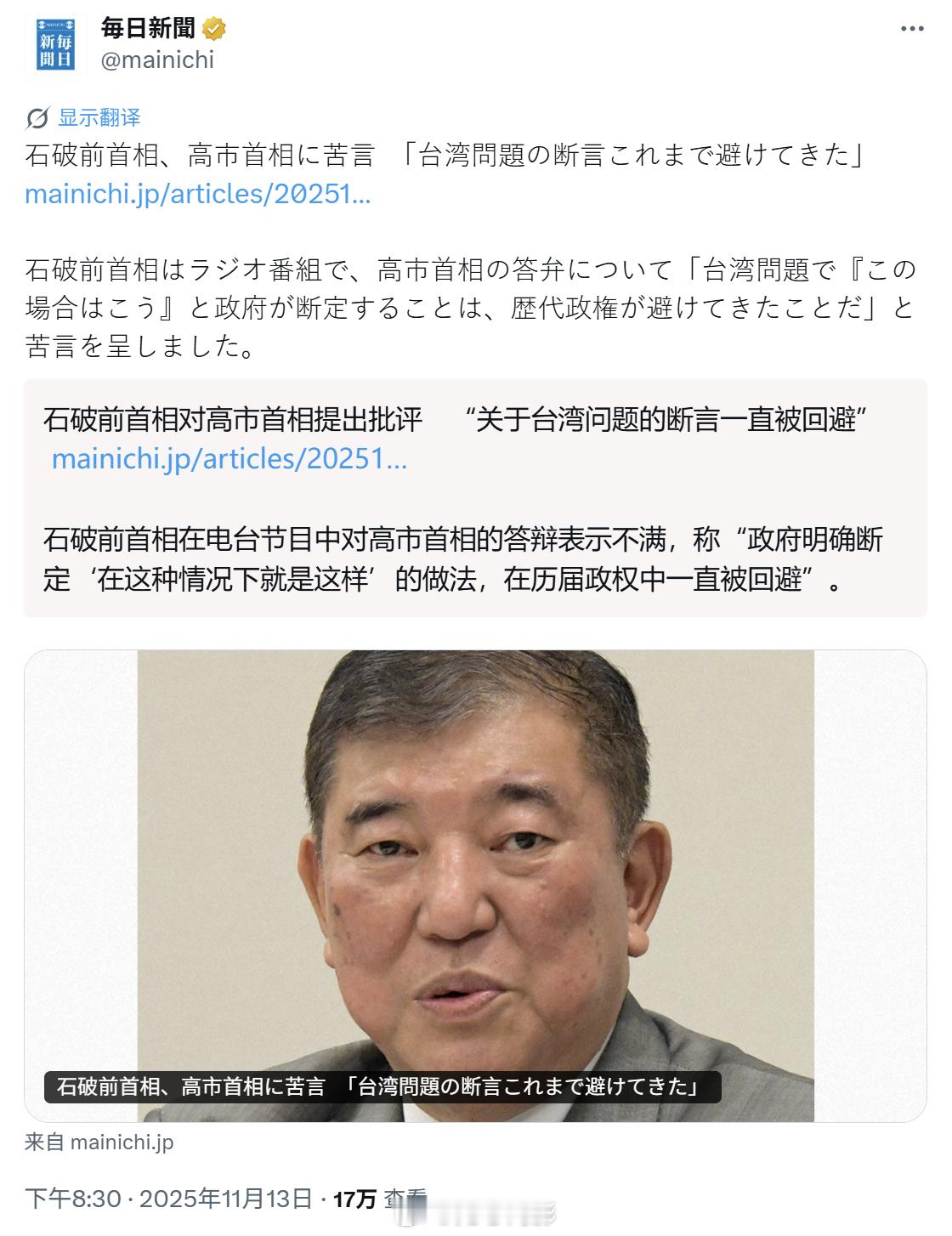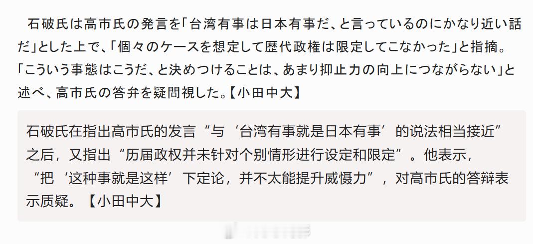 日本前首相石破茂表示,反对高市早苗关于武力涉台的的言论