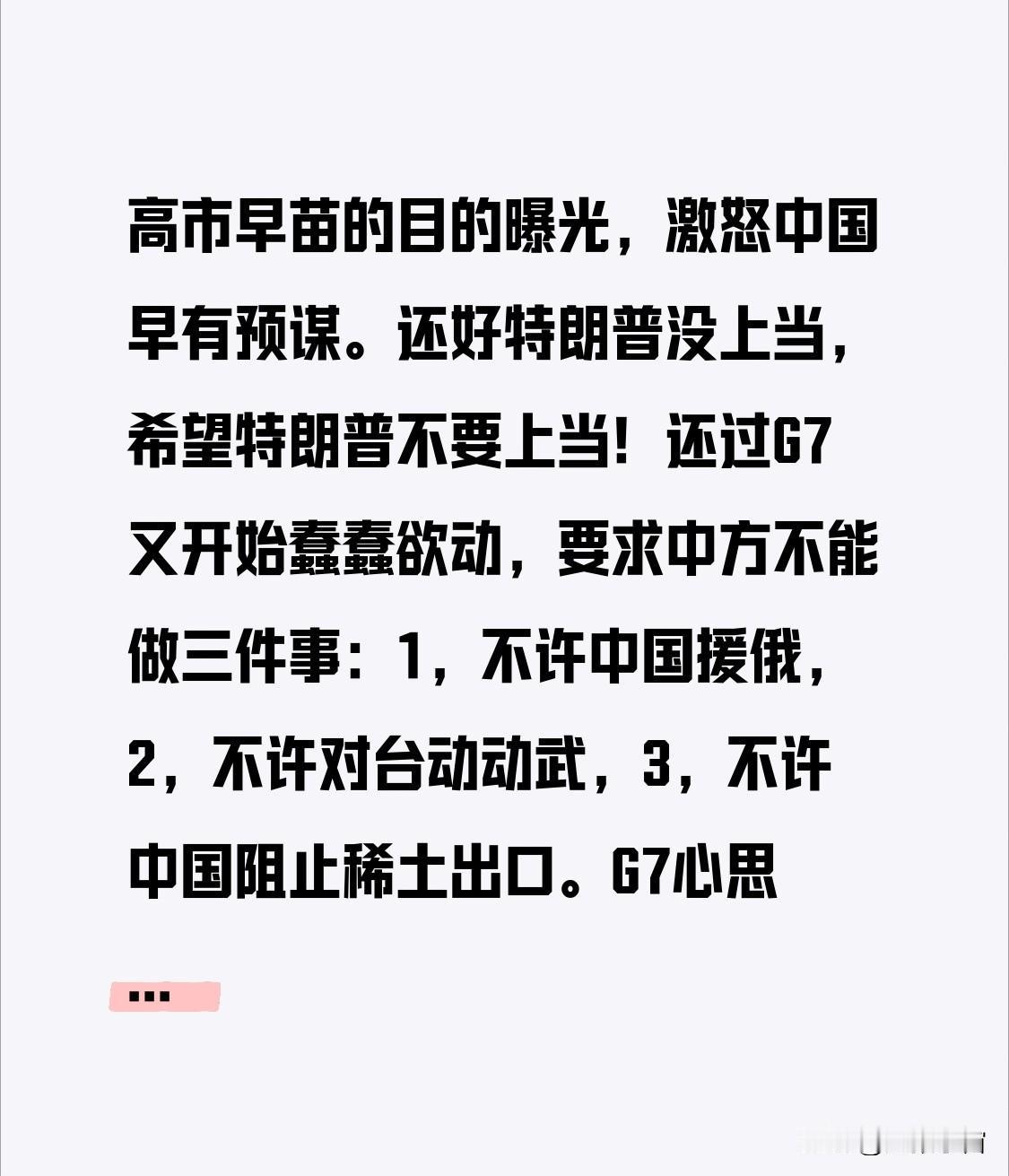 高市早苗的目的曝光,激怒中国早有预谋。 还好特朗普没上当,希望特朗普不要上当! 还过G7又开始蠢蠢欲动,要求中方不能做三件事:1,不许中国援俄,2,不许对台动动武,3,不许中国阻止稀土出口。 据东京方面消息,日本自民党最快下周,将讨论修改防务法案,其中包括“无核三原则〞是否修改,日本是否应该拥有核潜艇,日本军费开支占GDP比例等。 这可能才是日本叫器“台湾有事就是日本有事”的真实目的,不过日本是否真敢动武,还不好说,如果日本单枪匹马,给他十个胆子也不敢,但若有多国撑腰,就另当别论,毕竟日本搞偷袭是出了名的。高市早苗内阁 美国不希望中国那么快实现完全统一也可预见,所以日本闹事,美国大概率是隔岸观以,大概率也会明里暗里支持日本。 G7心思自然不用说,法国还好意思说邀请中国参加G7,不就是想当面给中国难堪吗,G7开会,哪一次少了中国话题? 所以“放弃幻想,准备战争”吧!