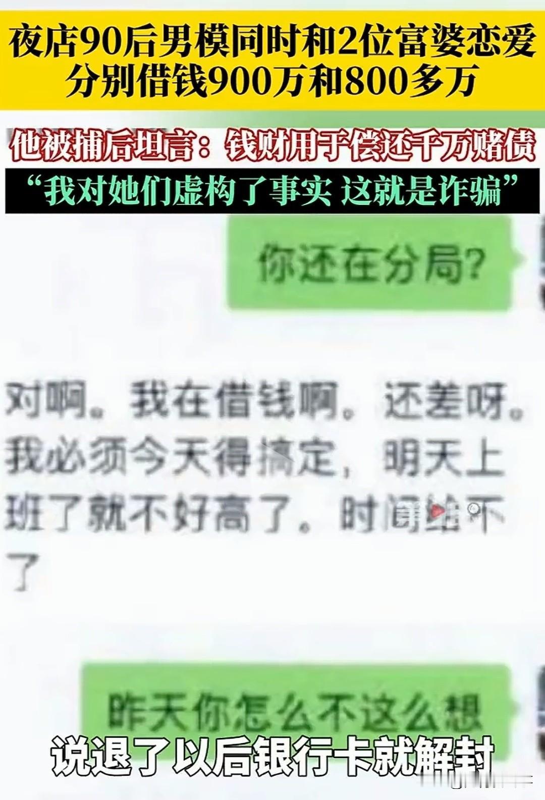 46岁女子借900万给小20岁男模,结局警醒无数人! 46岁事业有成的姐姐,本想在姐弟恋中寻温暖,却把半生积蓄都搭了进去。 这起央视曝光的案件里,3个关键点直击人心: 男模用“母亲生病”“银行卡解冻”等借口连环骗贷; 同时周旋两位富婆,骗款近2000万还赌债; 女子倾家荡产仍坚信对方“付出过真心”。 记住:恋爱中大额转账务必留借条、标“借款”,无证据的“信任”就是给骗子可乘之机。 你觉得这900万该全力追回吗?如果是你会轻易借大额钱给伴侣吗?评论区聊聊~