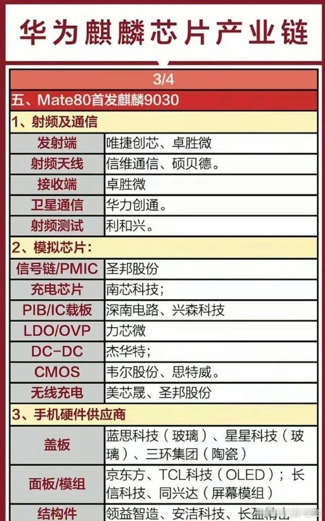 华为麒麟芯片产业链全梳理(下)1. 唯捷创芯:参与Mate80射频发射端供应,是国内射频芯片企业,为麒麟9030配套的终端通信功能提供发射端支撑,是终端信号输出的关键环节参与者。2. 卓胜微:覆盖Mate80射频发射/接收端,作为射频前端龙头,同时支撑信号收发,是麒麟芯片终端通信信号传输的核心配套方。3. 信维通信:供应Mate80射频天线,主营射频元器件,其天线直接影响终端信号接收能力,是麒麟终端通信体验的硬件支撑者。4. 硕贝德:为Mate80射频天线供应商,与信维通信协同保障终端天线需求,助力麒麟终端通信信号的稳定性。5. 华力创通:负责Mate80卫星通信环节,是终端卫星通信功能的技术支持方,支撑麒麟终端的特色通信能力落地。6. 利和兴:参与Mate80射频测试,提供射频性能测试配套,保障麒麟终端的通信性能达标。7. 圣邦股份:涉及Mate80信号链/PMIC及无线充电,作为模拟芯片龙头,同时支撑电源管理与无线充电,是麒麟终端功耗与充电功能的关键芯片商。8. 南芯科技:供应Mate80充电芯片,专注充电领域,直接影响终端充电效率与安全性,是麒麟终端充电功能的核心配套方。9. 深南电路:提供Mate80 PIB/IC载板,载板是芯片封装的关键载体,为麒麟芯片的终端封装提供硬件支撑。10. 兴森科技:为PIB/IC载板供应商,与深南电路协同满足载板需求,保障麒麟芯片终端的封装配套。11. 力芯微:负责Mate80 LDO/OVP环节,保障终端电路电压稳定,助力麒麟终端供电系统的可靠性。12. 杰华特:供应Mate80 DC-DC芯片,承担电源转换功能,适配终端不同模块的供电需求。13. 韦尔股份:参与Mate80 CMOS环节,主营图像传感器,为终端影像功能提供核心硬件,提升麒麟终端拍摄体验。14. 思特威:覆盖Mate80 CMOS与摄像模组,从图像传感器到模组,双重支撑麒麟终端的影像能力。15. 美芯晟:参与Mate80无线充电环节,与圣邦股份协同,提升麒麟终端的无线充电便利性。16. 蓝思科技:供应Mate80玻璃盖板,提供屏幕防护与外观支撑,是麒麟终端硬件的防护与外观配套方。17. 星星科技:为玻璃盖板供应商,与蓝思科技共同保障麒麟终端的盖板需求。18. 三环集团:提供Mate80陶瓷盖板,以高硬度材质丰富麒麟终端的盖板配置选择。19. 京东方:供应Mate80 OLED面板,国内面板龙头,为麒麟终端提供显示硬件,支撑终端显示功能。20. TCL科技:为OLED面板供应商,与京东方协同保障麒麟终端的面板产能。21. 长信科技:供应Mate80屏幕模组,集成屏幕部件,影响终端显示效果,助力麒麟终端的显示体验。22. 同兴达:为屏幕模组供应商,与长信科技协同配套麒麟终端的屏幕模组。23. 领益智造:供应Mate80结构件,作为终端骨架部件,保障麒麟终端的结构稳定性。24. 安洁科技:为结构件供应商,与领益智造协同支撑麒麟终端的硬件结构。25. 长盈精密:既供连接器也供结构件,在终端连接与结构环节双重配套麒麟终端。26. 欧菲光:供应摄像模组,集成光学部件,是麒麟终端影像功能的核心模组供应商。27. 舜宇光学:为摄像模组供应商,以光学技术提升麒麟终端的影像性能。28. 顺络电子:供应Mate80电感,作为基础被动器件,保障麒麟终端电路的信号与电源稳定。29. 风华高科:供应Mate80电容,与电感协同保障麒麟终端电路的稳定运行。30. 大富科技:供应Mate80滤波器,净化通信信号,提升麒麟终端的通信质量。31. 水晶光电:供应Mate80滤光片,优化摄像光线处理,提升麒麟终端的拍摄画质。32. 联创电子:供应Mate80光学镜头,直接影响拍摄清晰度,支撑麒麟终端的影像能力。33. 德赛电池:供应Mate80锂电池,为麒麟终端提供续航支撑,是终端续航的核心配套方。34. 欣旺达:为锂电池供应商,与德赛电池协同保障麒麟终端的电池供应。35. 电连技术:供应Mate80连接器,保障终端内部部件的信号与电源传输,支撑硬件协同。36. 汇顶科技:供应Mate80指纹识别方案,提供生物识别功能,是麒麟终端安全交互的配套方。37. 丘钛科技:为指纹识别供应商,与汇顶科技协同支撑麒麟终端的指纹识别功能。38. 光弘科技:参与Mate80代工,负责终端组装生产,是麒麟终端从部件到成品的落地支撑方。总结这些是麒麟芯片从“芯片”走向“终端产品”的关键支撑,超30家国内企业覆盖了终端的通信、显示、影像、续航等核心功能,以及生产组装全流程,体现了麒麟芯片终端的国产化配套深度,各企业在细分领域为终端的性能、体验与量产提供了针对性保障。股市有风险 投资需谨慎