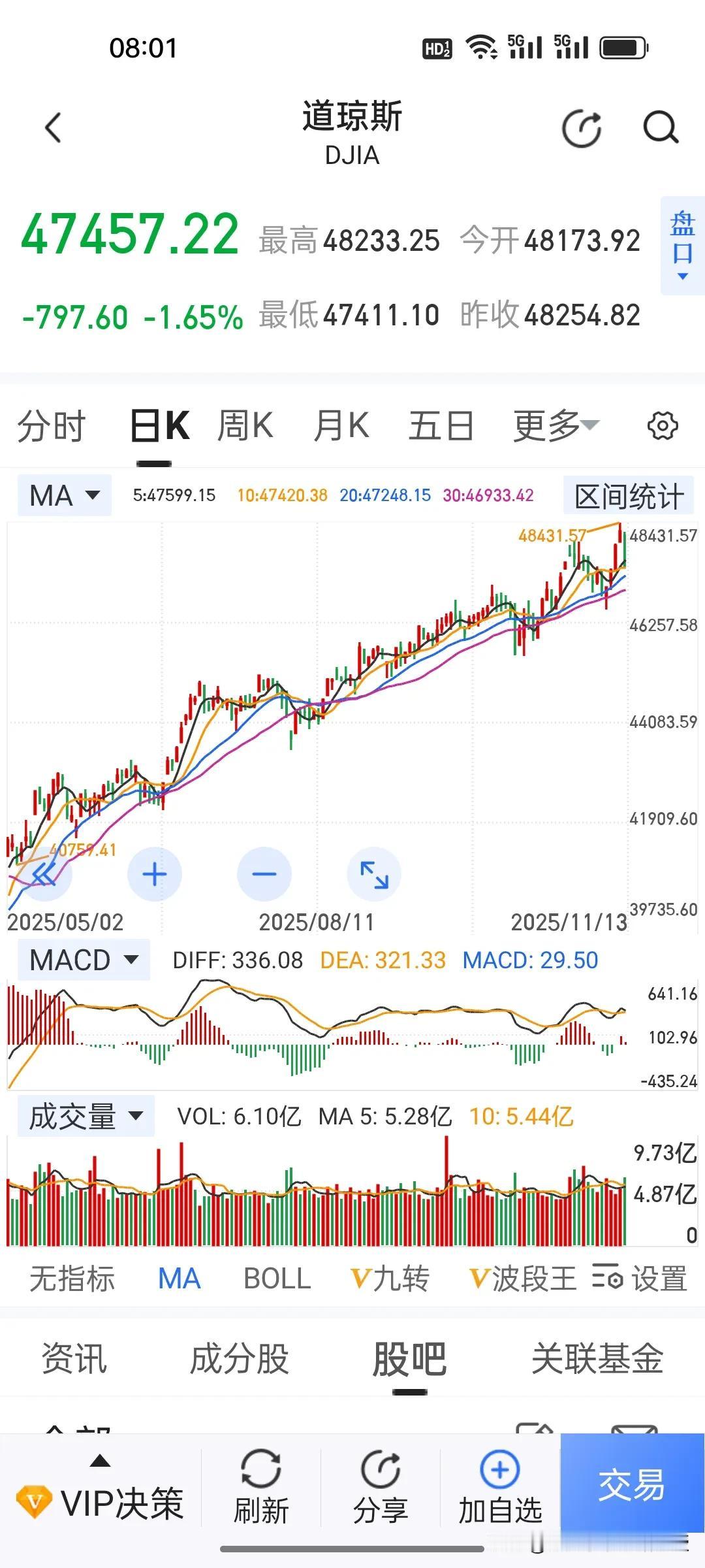 昨晚美股重挫!道琼斯指数下跌近800点!本以为美股创下新高后还会继续高歌猛进,谁想到突然急刹车! 由于政府停摆影响,美国10月CPI、失业率数据不发了,这引发市场的不确定性,再加上美联储降息预期降温,高估值科技股遭到重挫,美股迎来了“黑色星期四”。 美股这番暴跌会不会对今天A股科技股产生情绪上的影响?我认为影响还是有的,但是A股还是会维持4000点震荡的格局不变,接近年底,前期涨幅较大的科技股会有机构调仓换股的需求,但中长期有AI产业趋势与国家政策面支撑,A股慢牛的格局不会变。