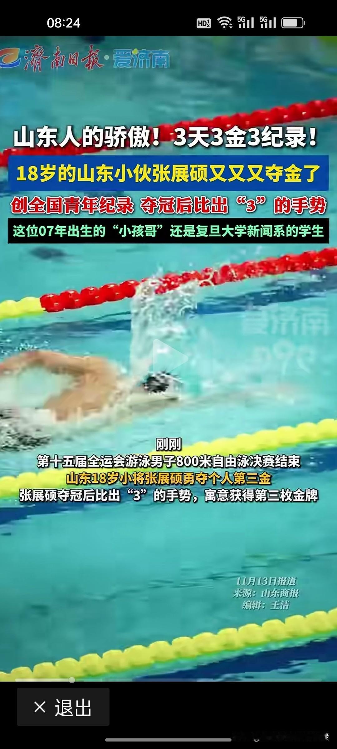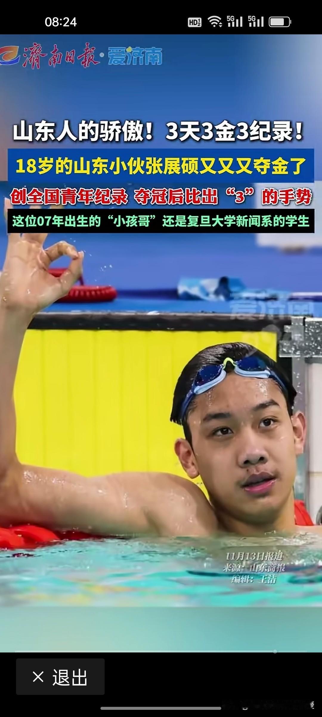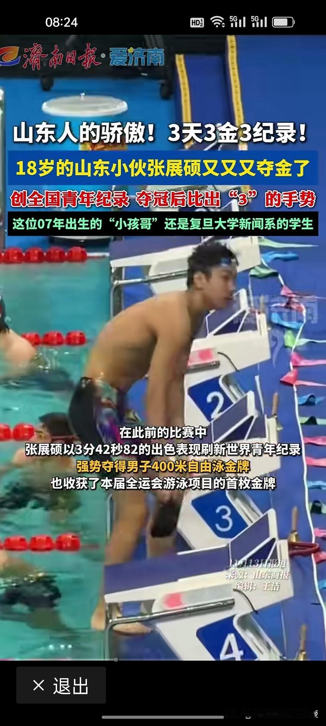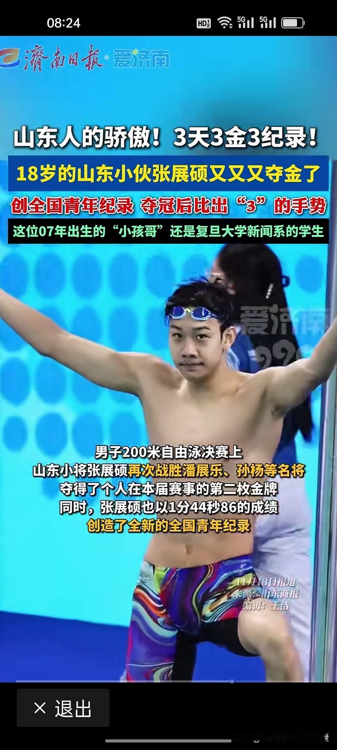 确实是长江后浪推前浪啊!18岁复旦大学新闻系的张展硕3天拿了三块金牌🥇,创造了三项新纪录,确实是山东的骄傲!“江浙沪包游”的神话被打破。 很多人拿张展硕和21岁的潘展乐(拿了一块金牌)做比较,其实运动员有无限可能性,竞技体育的魅力就在于不到最后一刻就猜不到结果,没必要去捧高踩低,他们两个的强项不同,潘展乐更适合短距离,是爆发力极强的选手,张展硕是中长距离的佼佼者,对耐力的要求更高。 张展硕不愧是新闻系的高材生,说自己还在追赶潘展乐,应该是期待在更高的舞台展示自己的实力,张展硕用了谦逊的“追赶”,而不是“超越”,这个小伙子未来前途无量![赞][赞][赞]