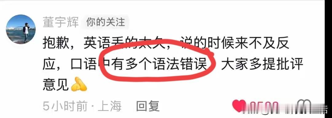 董宇辉的英语被疯狂英语李阳吐槽了,说他在进博会的交谈中有多处语法错误。 董宇辉也承认自己确实,英语丢的太久,错误情况属实。 这件事还上了热搜。 毕竟董宇辉作为新东方的英语老师,在大家的印象当中,英语是他的强项,没成想还犯了这些错误,所以李阳说学英语还得到疯狂英语[笑哭][笑哭]