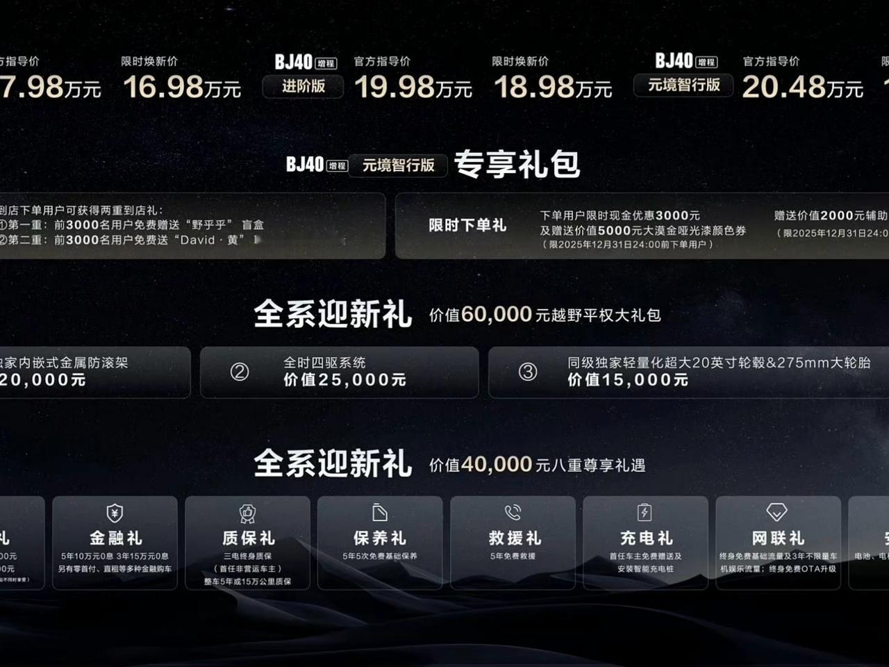 北京越野BJ40增程元境智行版上市,售价17.98万元-20.48万元,11月30日前可享限时焕新价16.98万元-19.48万元。新车采用地平线提供的纯视觉辅助驾驶方案,配备11个高清摄像头、3个毫米波雷达、12个超声波雷达,让硬派越野车不越野也行!动力方面,BJ40增程元境智行版依旧搭载1.5T增程系统,综合最大功率403kW,峰值扭矩655N·m,CLTC纯电续航152km,CLTC综合续航1200km。【来自懂车帝车友圈】