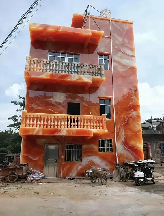 隔壁新落成的小楼造型别致,但这配色总觉得哪里不对劲。你看这墙面色调是不是有点违和