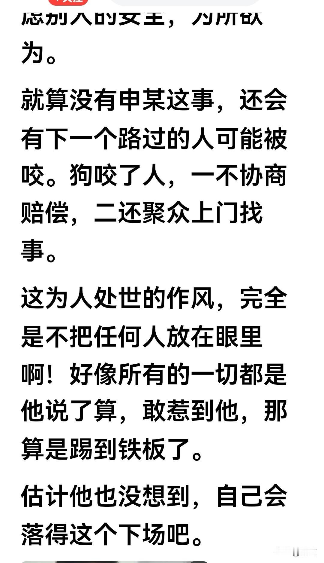 俗话说“狗仗人势”,你稍微留意一下周围养狗人,就会发现狗和它主人一个德行。 有修养的人,养的狗子也温顺乖巧。 霸道的人,养的狗子也是凶恶蛮横。 而且,他们还不栓绳子,让狗在公共场所恣意妄为。 其实,这些恶狗的行为,正是狗主人内心世界的外延。 这些人本身多是凶顽之徒,在这些年的打黑除恶高压下,无处释放,就借狗发泄而已。 所以,山西长治郭某之狗恶,其实就是郭某之恶,借狗横行邻里,最终得到了报应。 这些借狗横行邻里的恶霸,派出所确实不好管理,说到底是个畜牲作恶,你能怎么着,无非赔几个钱,可人家又不差钱。 其实,司法机关应该从山西长治申某的这次判决中动动脑筋。 如果判决申某无罪释放,属于正当防卫,我估计以后养恶狗的人,自然都收敛了。 生怕自己也遇到一个申某人,白白枉送了狗命,岂敢再猖狂乎!