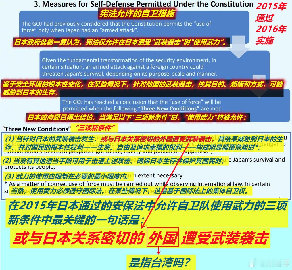 图1:高市最近“动武保台”的言论,其实佐证了在十年前日本通过的“安保法”中,日政府可能出尔反尔地将中国台湾省视为“外国”;图2:不过好在十年前解放军就开启了以“能打仗、打胜仗”为抓手的“大军改”——十年来已把曾经砍向鬼子头上的“大刀”打磨的相当锋利了。如今高市言论的更加证明,解放军的“大刀”还要继续打磨的更加锋利。!