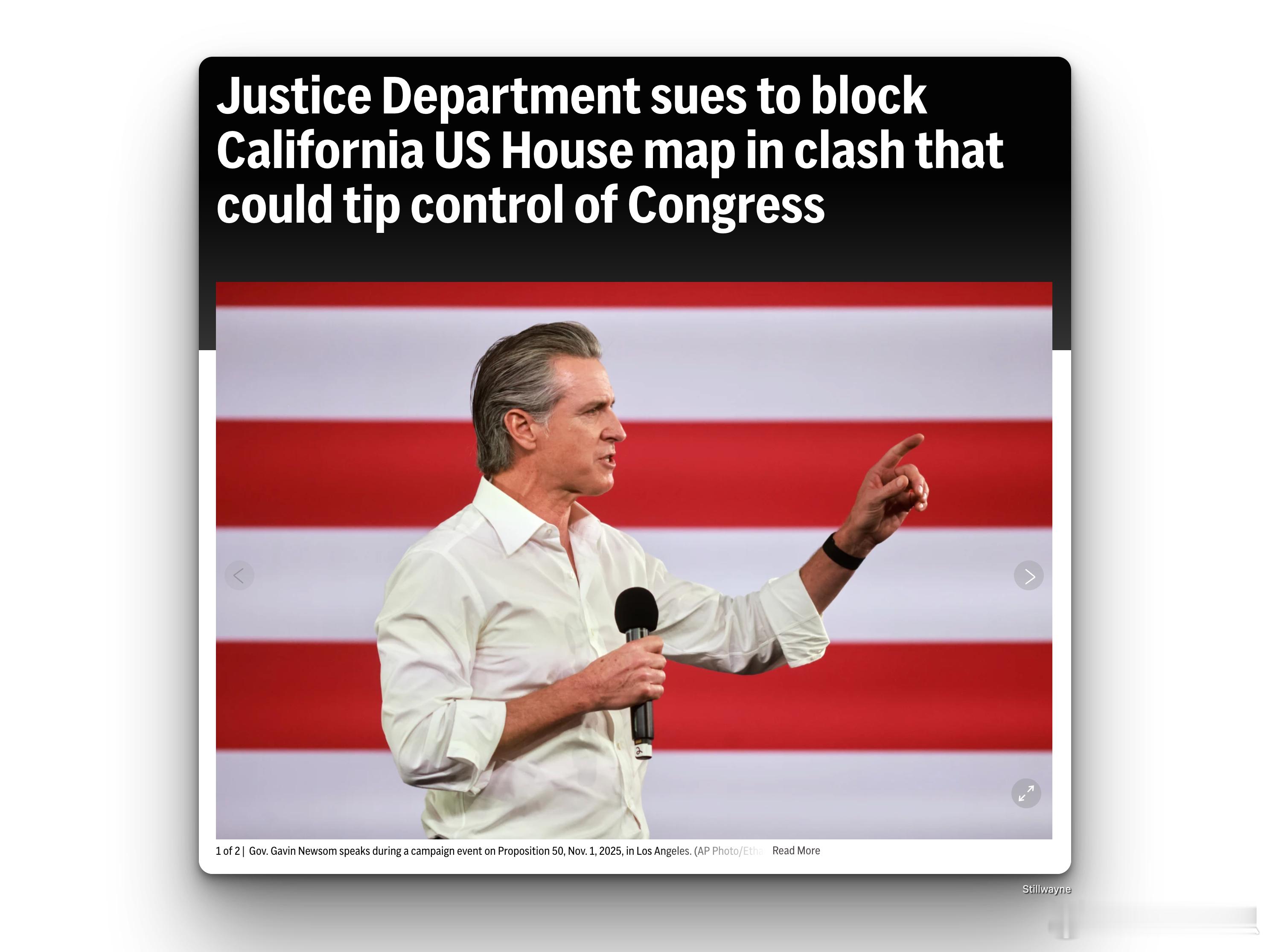美国司法部提起诉讼,试图阻止加州选区划分方案的实施美国司法部周四提起诉讼,试图阻止加州选民上周批准的新国会选区划分。加州的方案是为了回应德克萨斯州共和党主导的、并得到特朗普支持的类似方案。这预示着共和党政府与这位被视为2028年总统大选有力竞争者的民主党州长之间将展开一场高风险的法律和政治斗争。司法部长帕姆·邦迪在一份声明中表示: “加州的选区重划方案是公然攫取权力,践踏公民权利,嘲弄民主进程。纽森州长企图巩固一党专政,压制数百万加州民众的声音,这种做法绝不会得逞。”